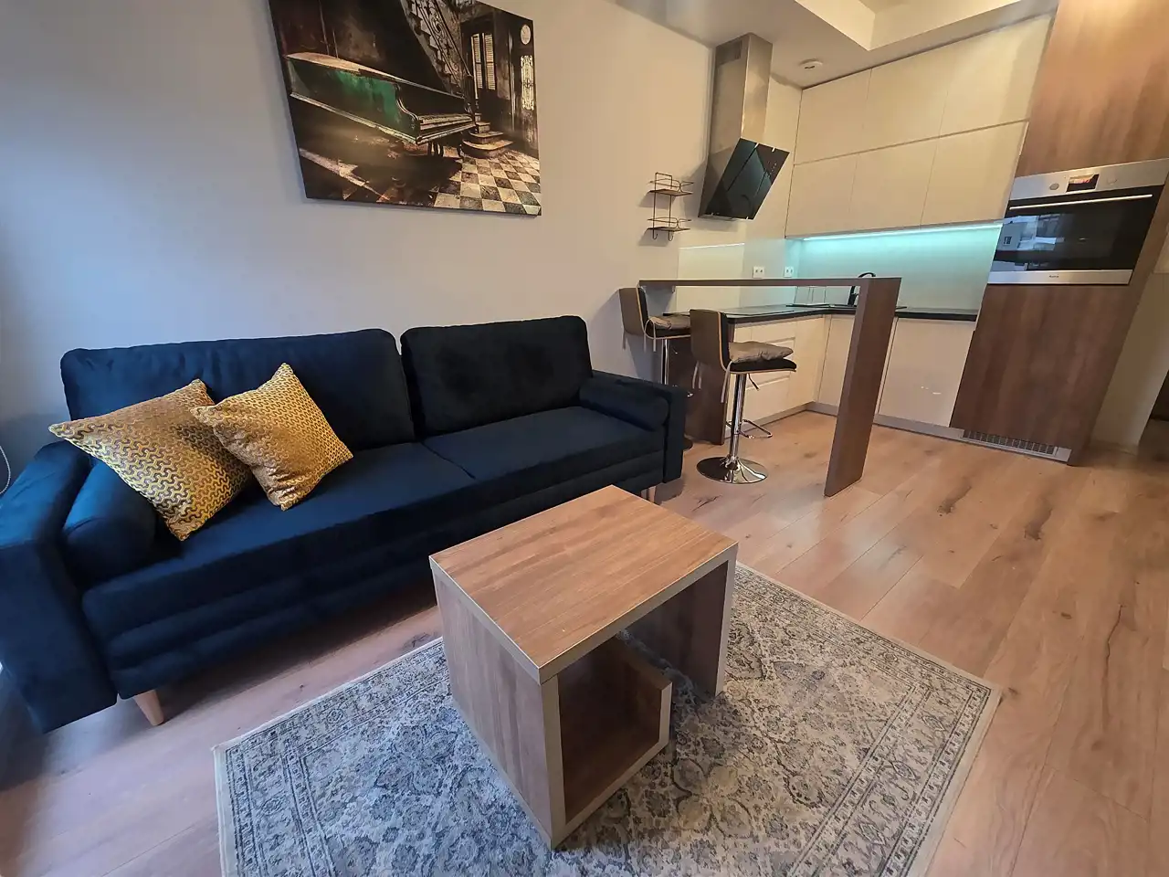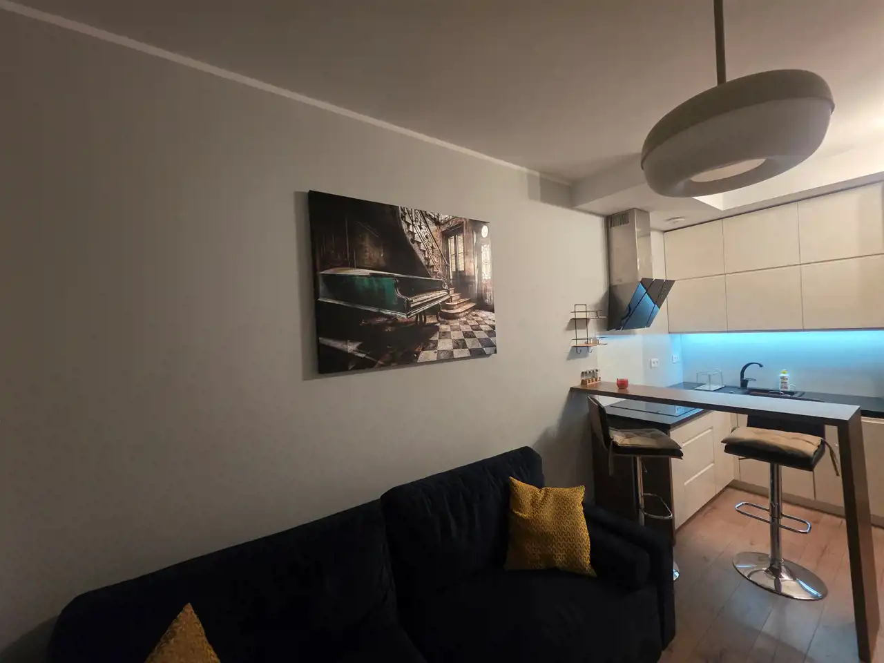 Przytulny salon z aneksem kuchennym z wyjściem na balkon, sypialnia, łazienka, przedpokój oraz garderoba.o łącznej powierzchni ok.40 m2. Mieszkanie w pełni umeblowane oraz wyposażone.