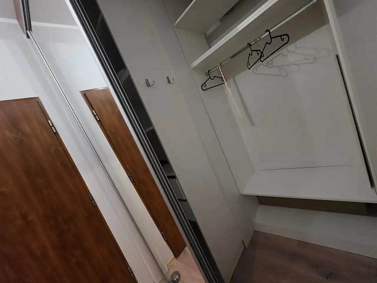 W sypialni znajduję się duża szafa oraz sypialniane łóżko. Łazienka wyposażona w kabinę prysznicową oraz pralkę.