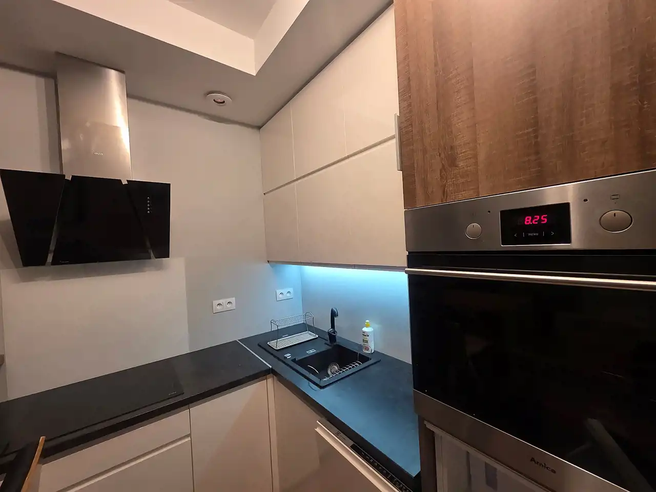 Aneks kuchenny wyposażony w sprzęt AGD (lodówka, okap, piekarnik, płyta ceramiczna).
