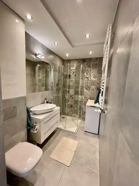 ŁAZIENKA Z WC- kabina prysznicowa duża, pralka, szafa w zabudowie, glazura i terakota.