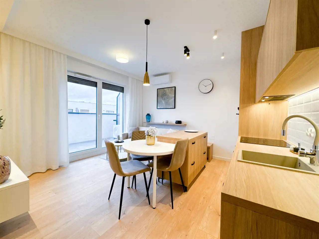 Kuchnia: sprzęty kuchenne (płyta indukcyjna, okap, piekarnik, zmywarka, lodówko-zamrażarka).