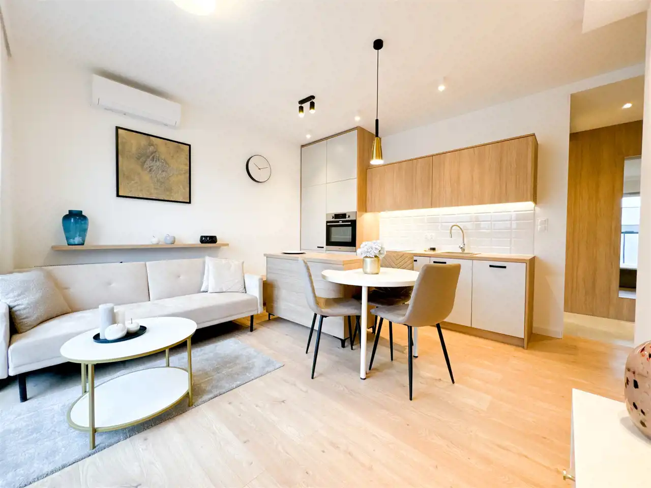 Salon: sofa 3-osobowa, stolik, stół z 3 krzesłami, biała komoda z miejscem i podłączeniem pod TV, klimatyzacja.