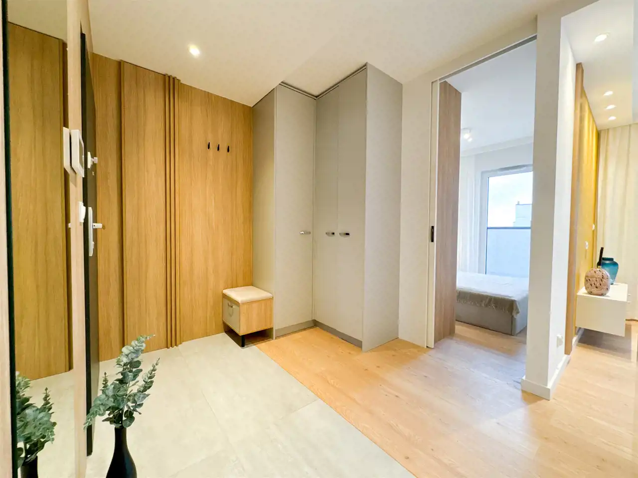 Przedpokój z lustrem, pufem i szafą do przechowywania.