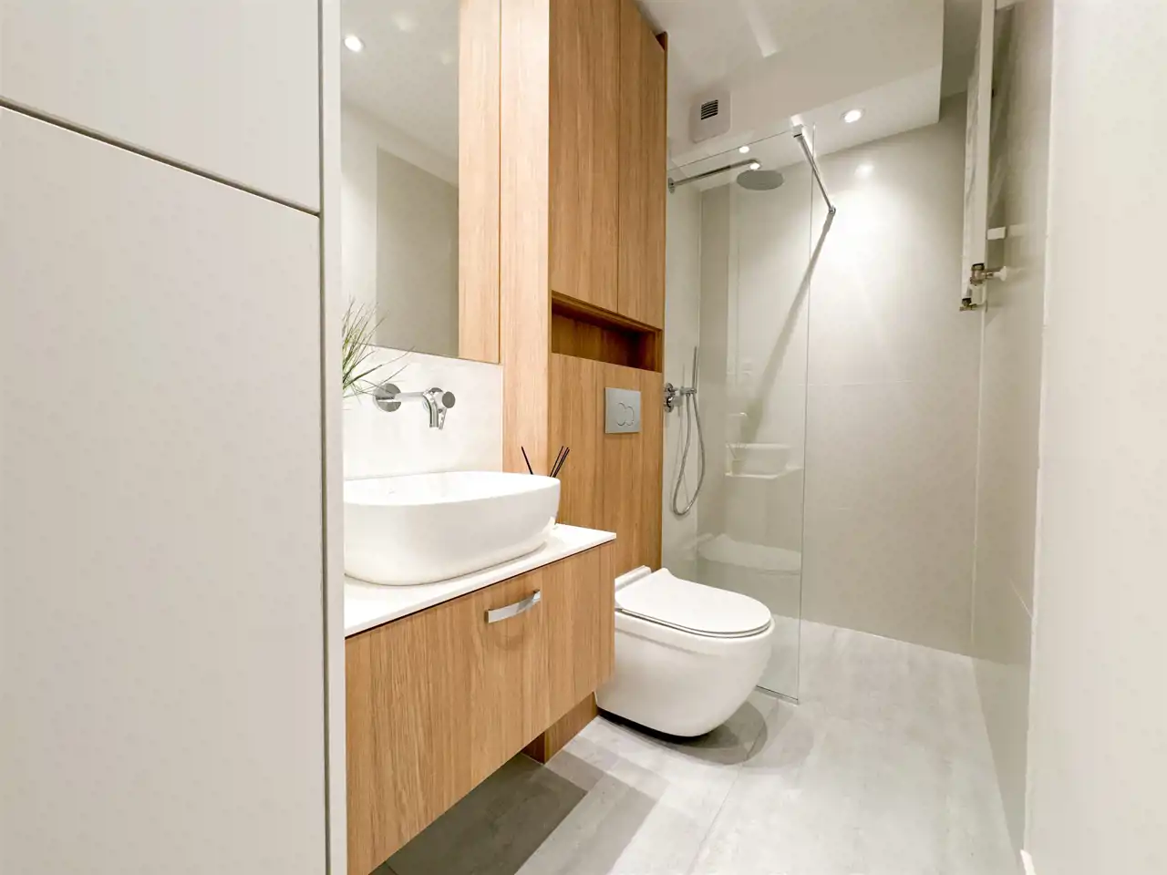 Łazienka: prysznic walk-in z baterią z deszczownicą, podwieszane WC, umywalka nablatowa z szufladami, zabudowa meblowa, pralka.