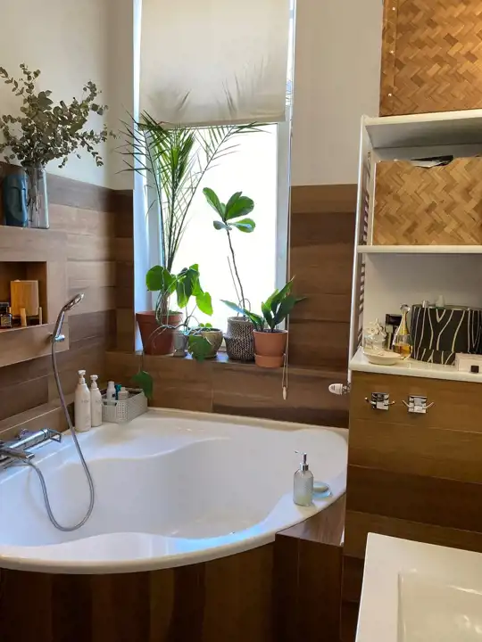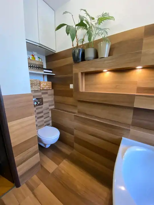 Łazienka z dwuosobową wanną, toaletą i zabudową.