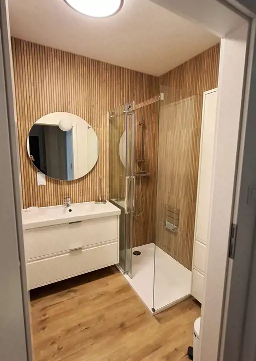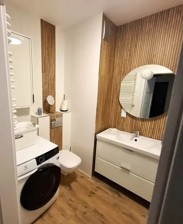 - łazienki razem z WC wyposażonej w: dużą kabinę prysznicową, pralko-suszarkę, szafę na ręczniki oraz szafkę na kosmetyki; lustro, pod umywalką znajdują się 2 duże szuflady, na ścianach kafle i drewno