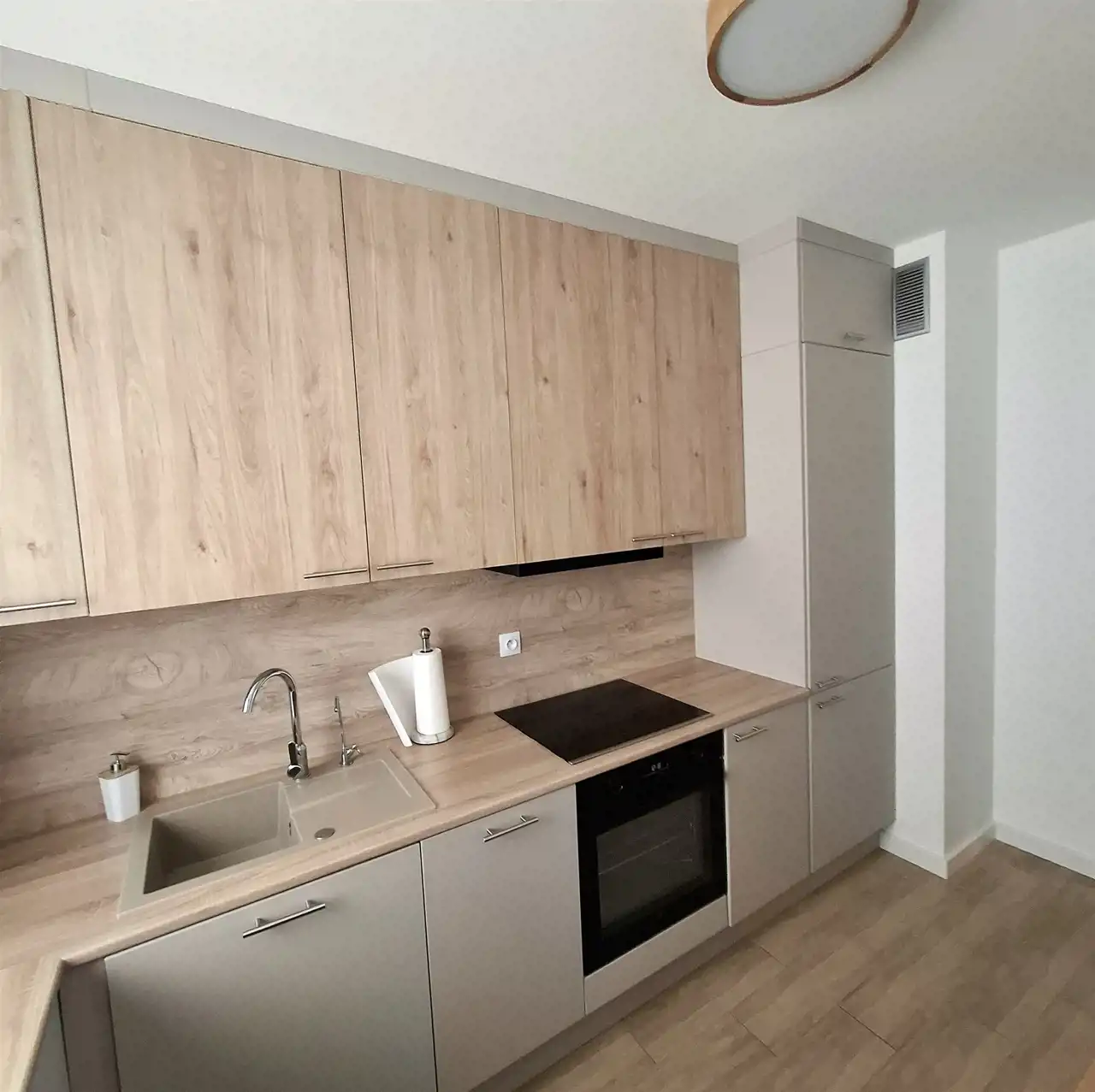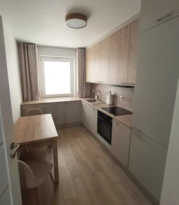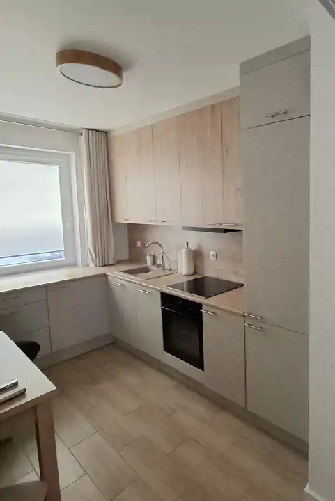 - osobnej kuchni wyposażonej w nowoczesną, wysokiej jakości zabudowę o modnym kaszmirowym kolorze, wysoką zabudowaną lodówko-zamrażarkę, płytę indukcyjną, piekarnik, zmywarkę, okap oraz filtr wody pod zlewozmywakiem, na oknach nowe roletki i zasłony, dodatkowo stół i 2 krzesła