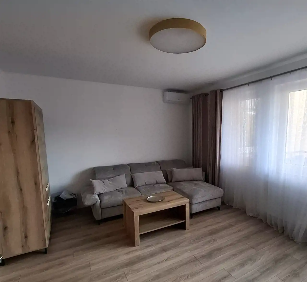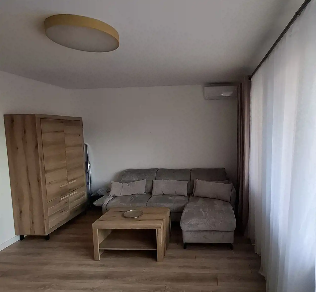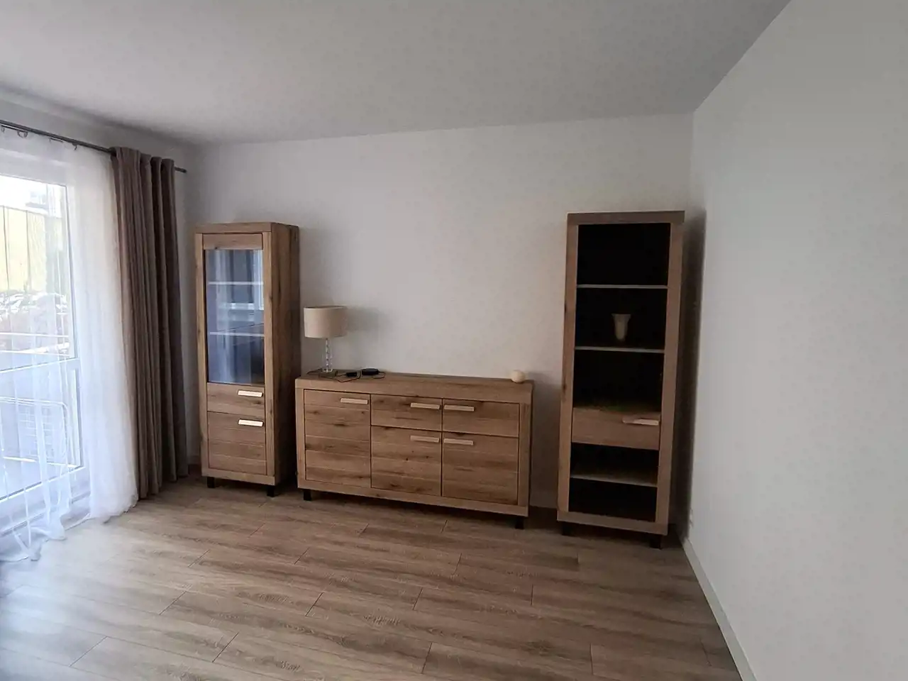 - salonu, z którego jest wyjście na balkon wyposażony w meble ogrodowe; w salonie znajdują się: nowy rozkładany narożnik z funkcją spania, szafa, szafka pod sprzęt RTV, 2 witryny, na oknach nowe firany i zasłony; w salonie również zamontowana jest klimatyzacja