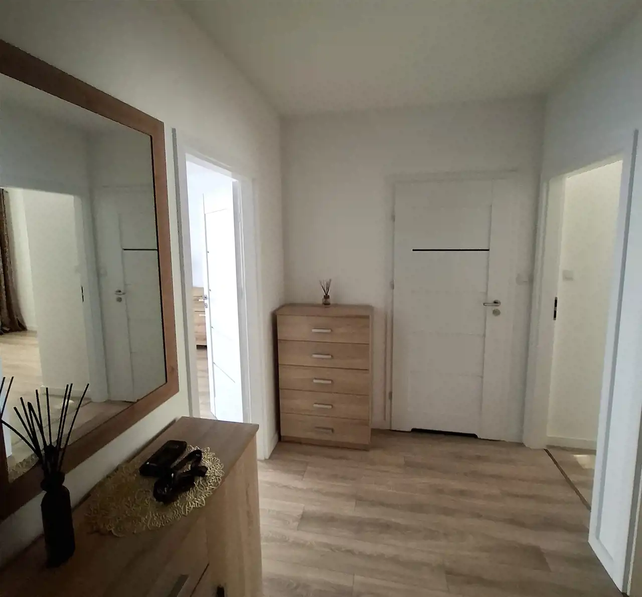 - korytarza z dużą szafą, 2 komodami i lustrem.