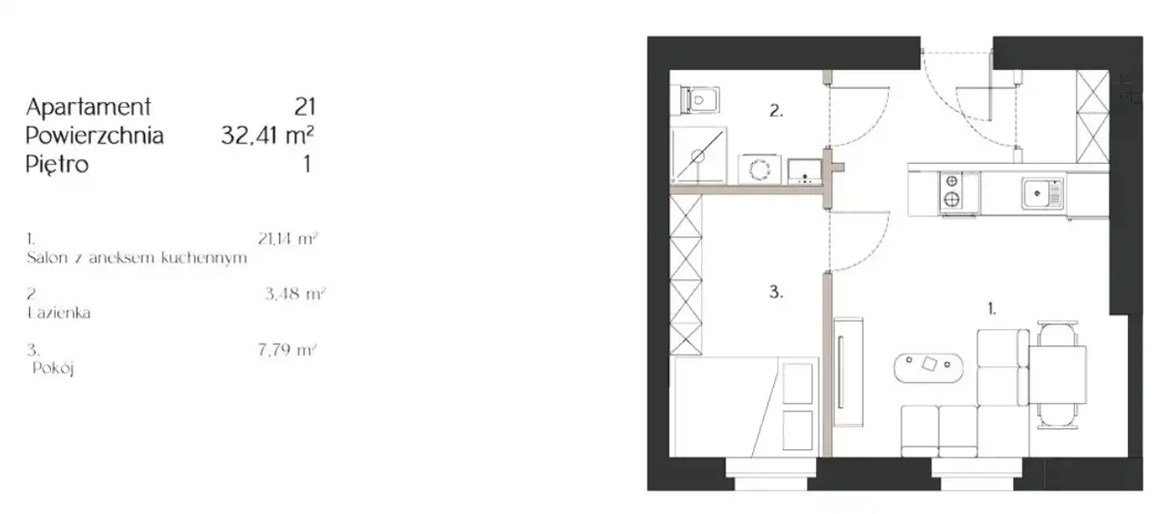 - Charakterystyka mieszkania 32.41 m2, 2 pokoje