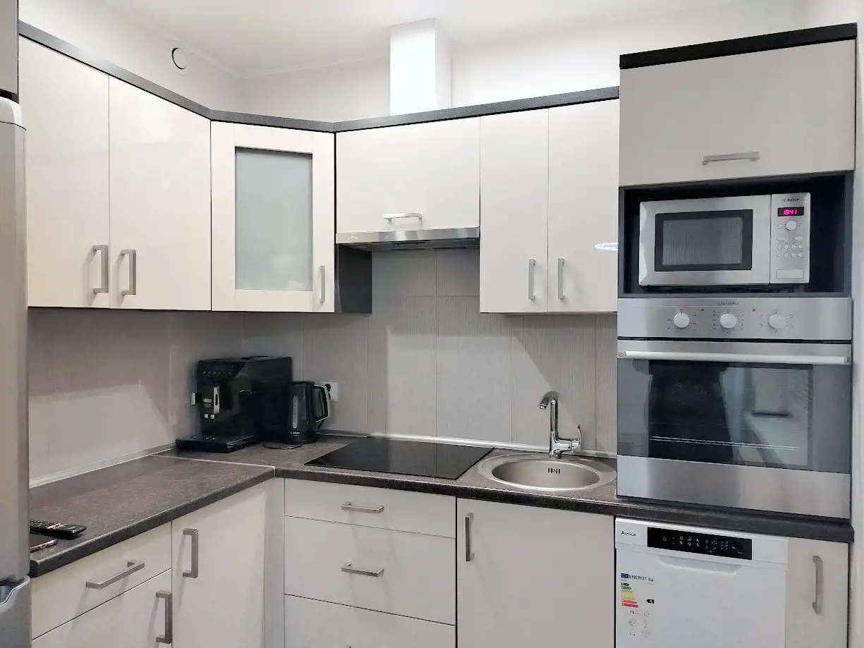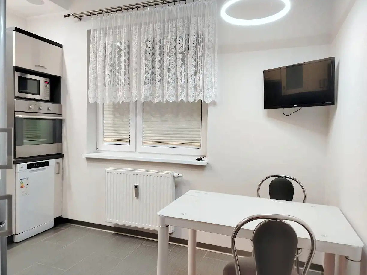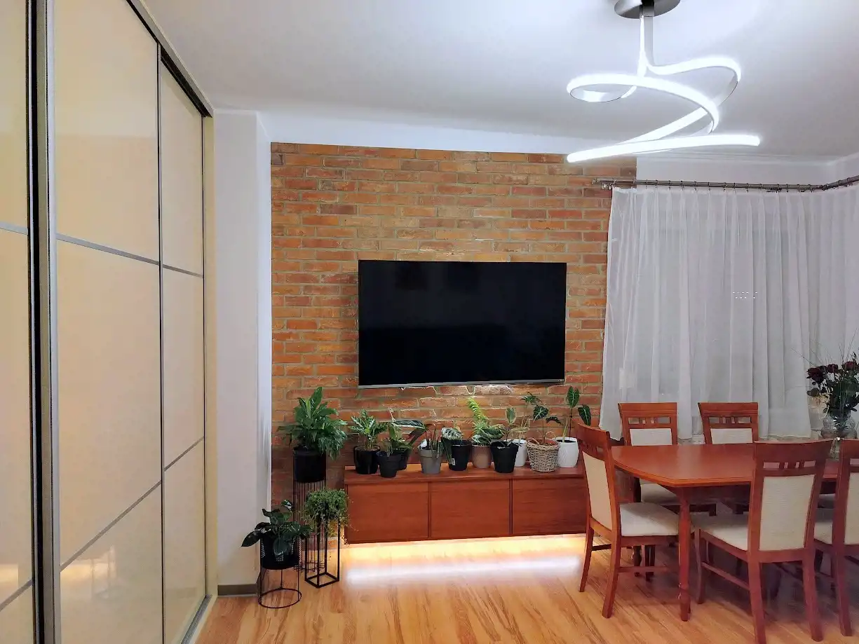 Mieszkanie jasne i słoneczne, kompletnie umeblowane. W salonie, który zdobi oryginalna cegła na ścianie, znajduje się rozkładany narożnik, duży stół z 6 krzesłami, komoda, duży TV i pięciodrzwiowa zabudowa Komandor.