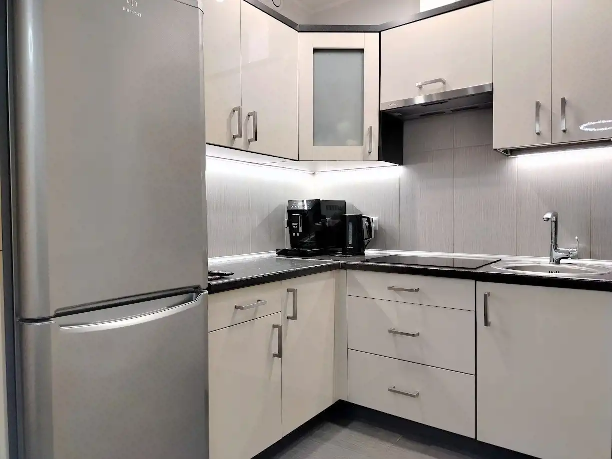 Kuchnia z jasną zabudową oraz dużą lodówko- zamrażarką, płytą indukcyjną, piekarnikiem i zmywarką oraz stołem z krzesłami.