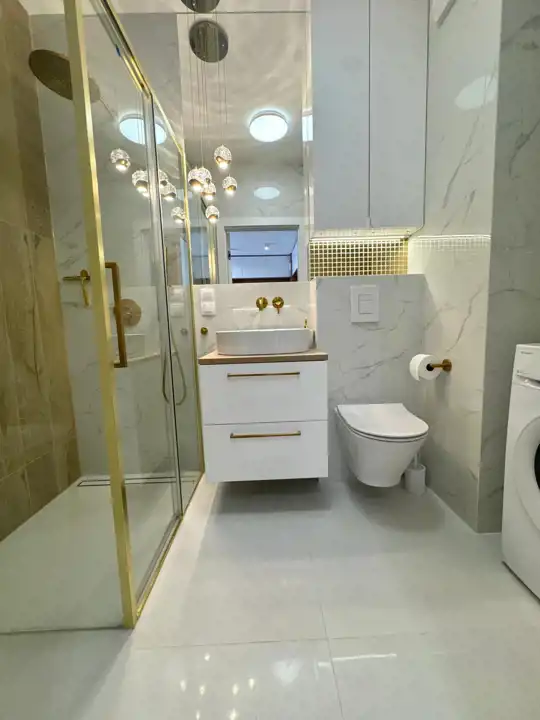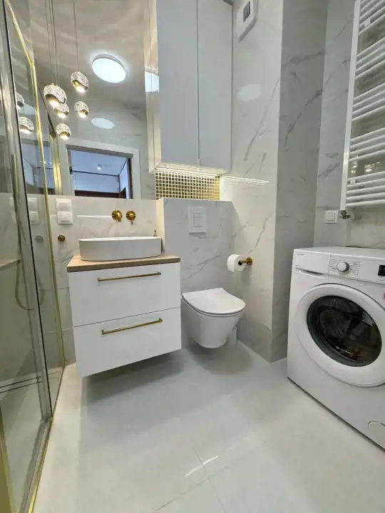 Łazienka: zamykana kabina prysznicowa z baterią z deszczownicą, podwieszane WC, umywalka nablatowa oraz szuflady, pralka i zabudowa meblowa.