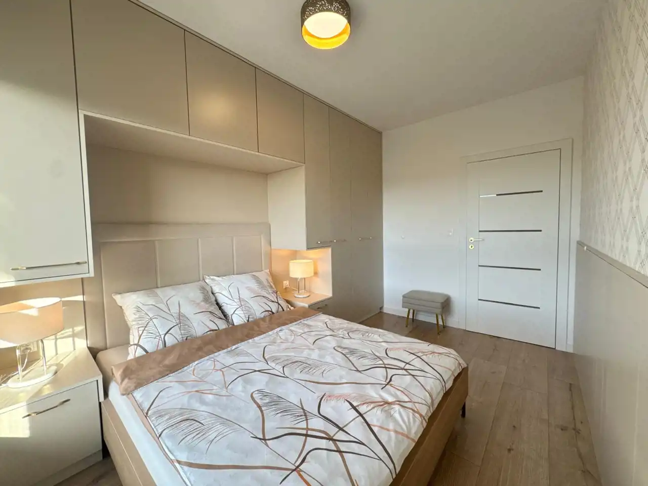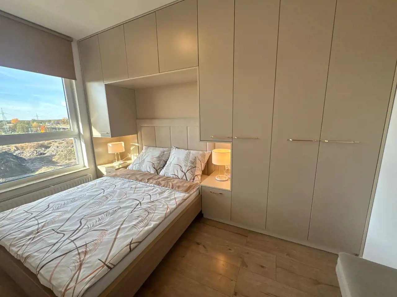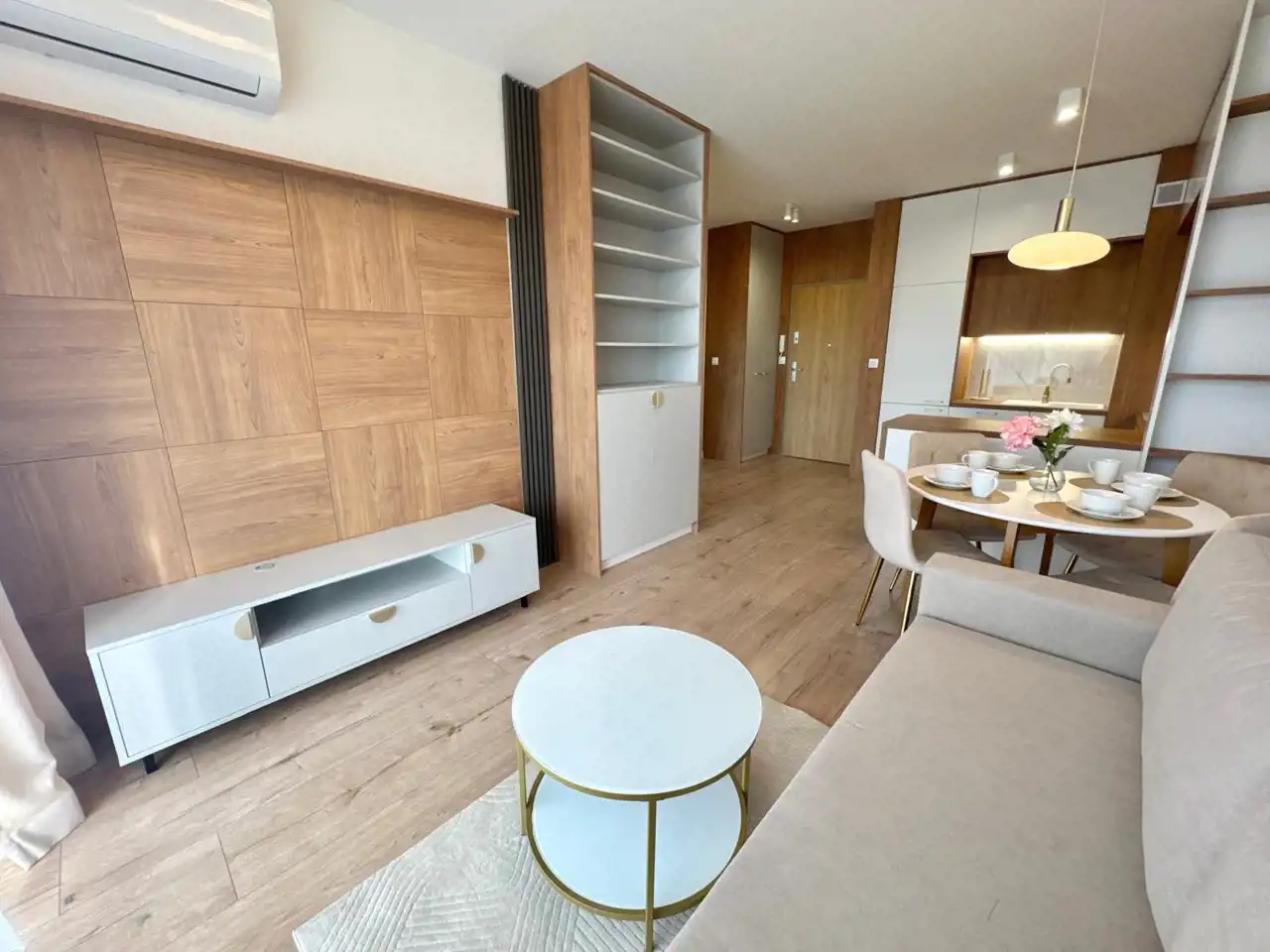 Mieszkanie nowoczesne z funkcjonalnym układem. Mieszkanie posiada salon z aneksem kuchennym z klimatyzacją, z którego wyjść można na balkon, oddzielną sypialnię oraz łazienkę. Dużo szaf do przechowywania w sypialni, także w holu i łazience.