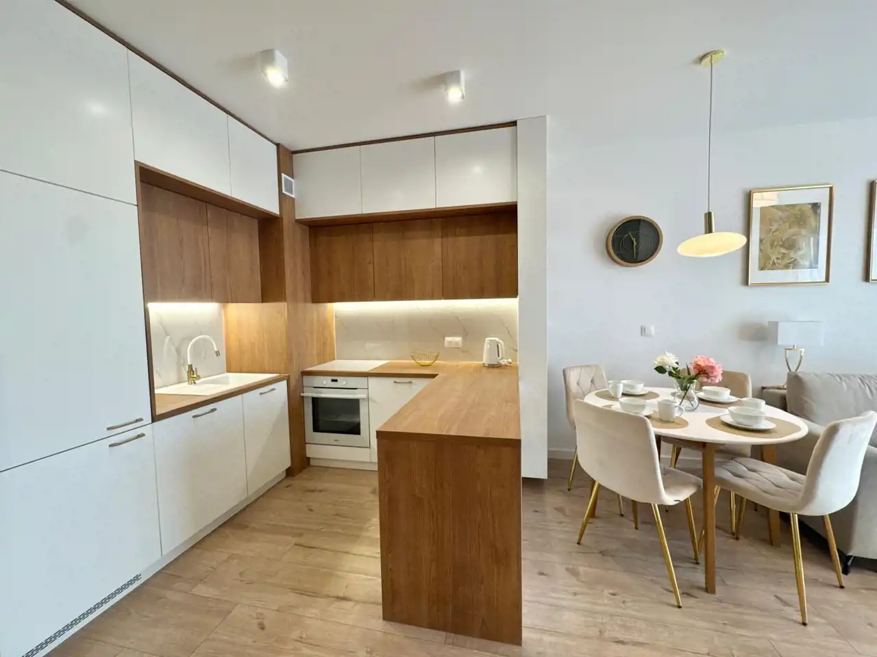 Kuchnia: Sprzęty kuchenne są na gwarancji (płyta indukcyjna, okap, piekarnik, zmywarka, lodówko-zamrażarka).