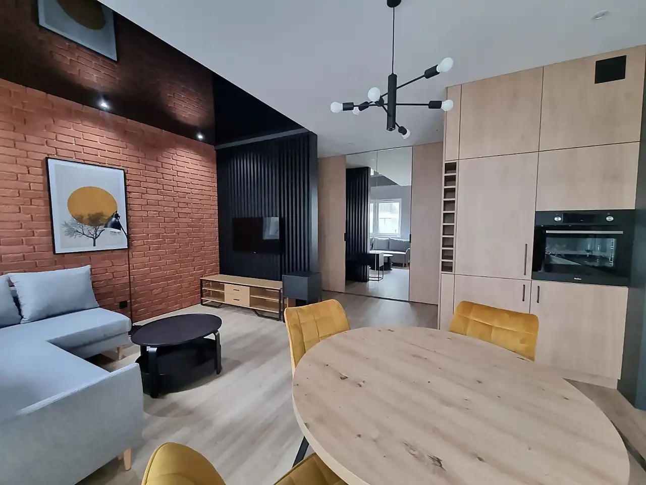 Salon z aneksem kuchennym, nowoczesna kuchnia ze sprzętami wysokiej klasy,przestronny przedpokój w dużych szafach .