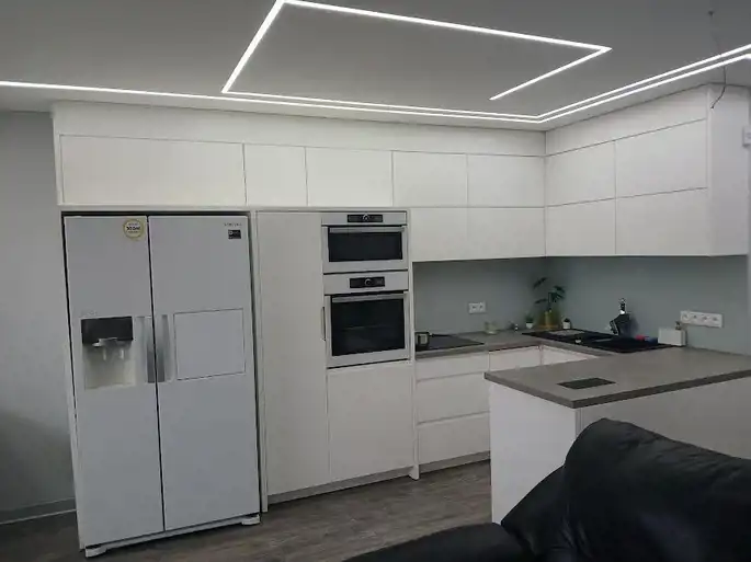 w aneksie kuchennym zabudowa kuchenna oraz wysokiej jakości sprzęt AGD: piekarnik w zabudowie, kuchenka mikrofalowa w zabudowie, płyta elektryczna w zabudowie, wolnostojąca lodówko- zamrażarka Side by Side, zmywarka 45 cm,