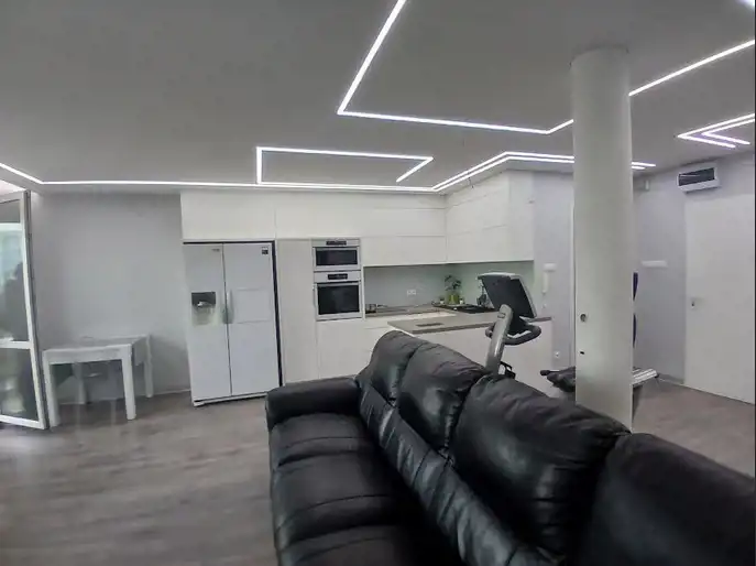 w salonie: sofa skórzana, stół, krzesło, komoda, witryna, stolik RTV, rower treningowy, szafa w zabudowie,