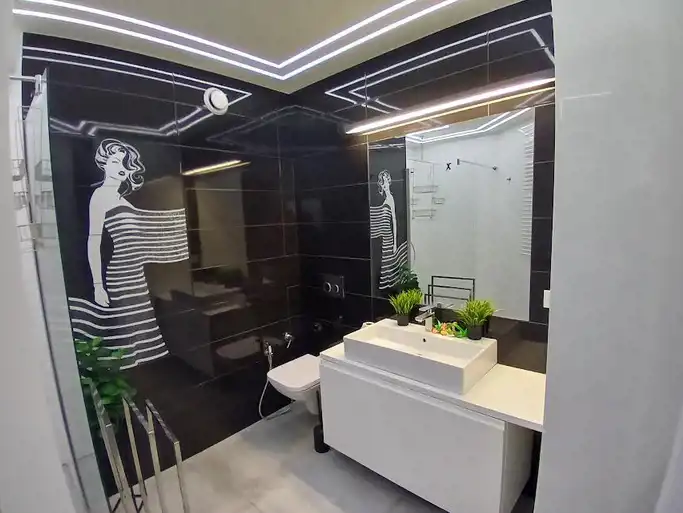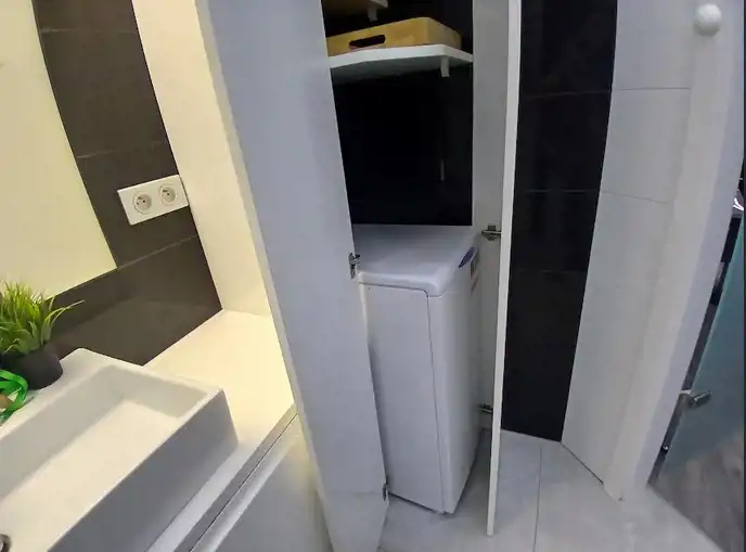 w łazience: umywalka, wc, prysznic, szafa w zabudowie, pralka.