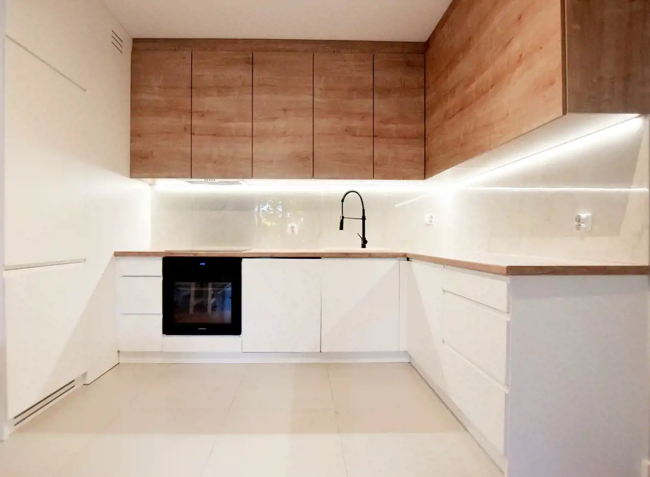 - pokój z aneksem kuchennym: narożnik z funkcją spania, komoda pod telewizorem, stół z krzesłami, stolik kawowy, zabudowa kuchni ze sprzętem AGD: duża lodówka, zamrażalnik, piekarnik i płyta elektryczna, zmywarka
