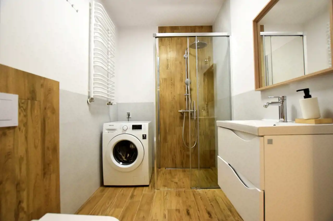 - łazienka z wc (kabina prysznicowa, wc, pralka).