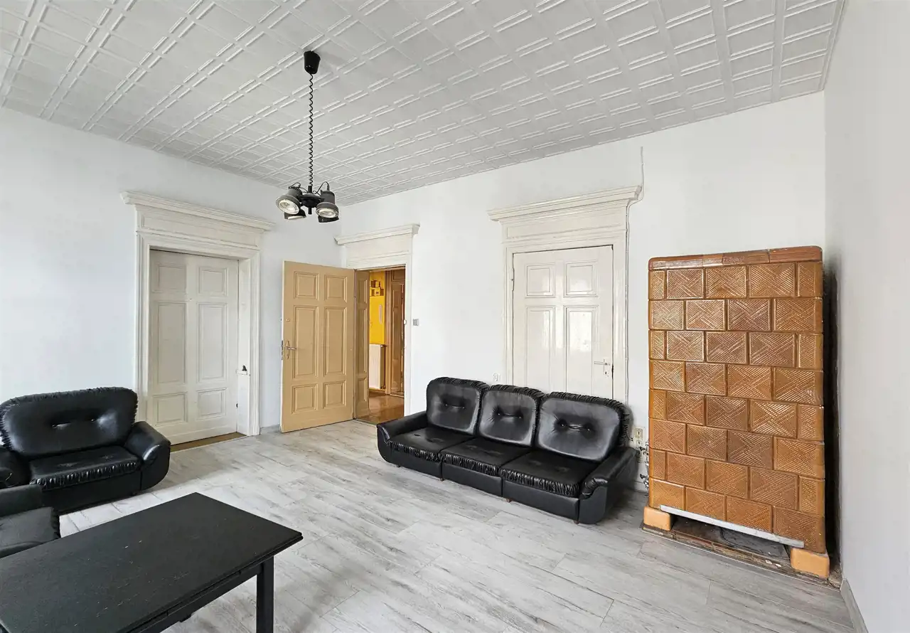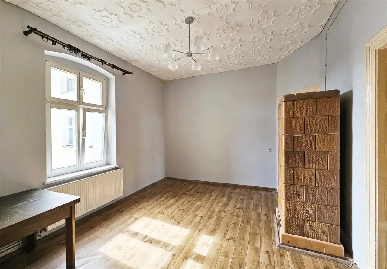 Zachowana oryginalna stolarka drzwiowa oraz w każdym pokoju piec kaflowy; na podłogach panele i wykładziny, na ścianach odnowione gładzie.