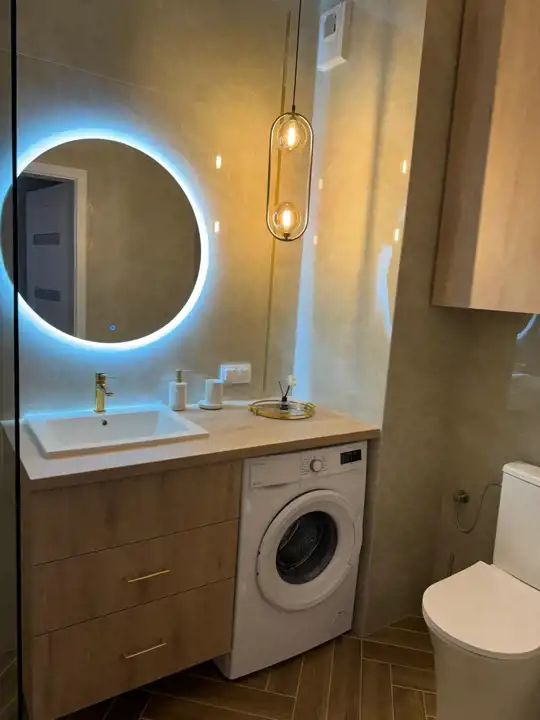 Łazienka: kabina prysznicowa z baterią z deszczownicą, podwieszane WC, umywalka nablatowa oraz szuflady, pralka.