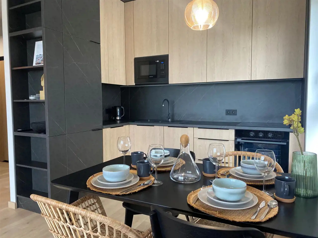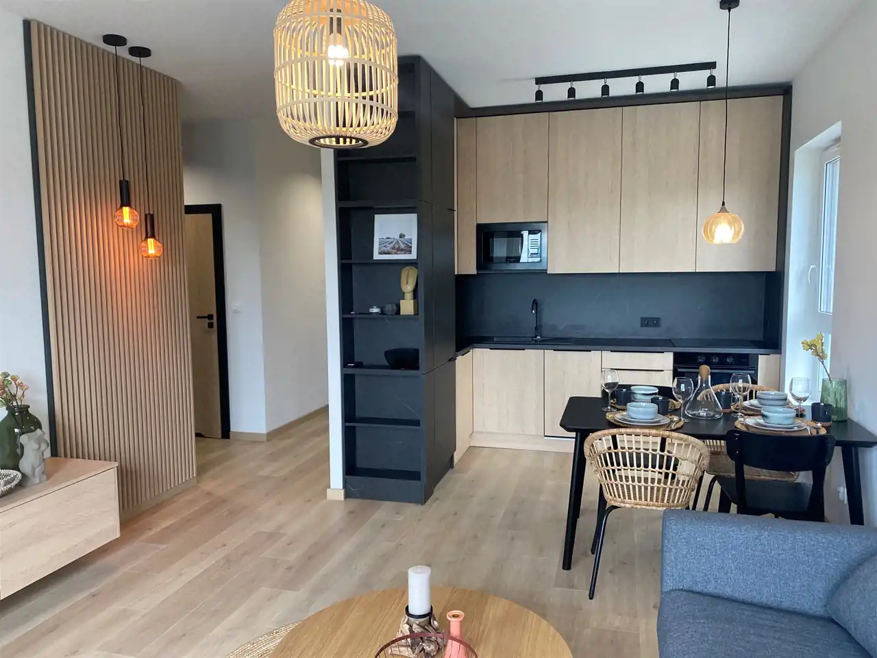 Ten 3-pokojowy apartament o powierzchni 60 m2 składa się z salonu z aneksem kuchennym, tarasu 10 m2, 2 sypialni, łazienki oraz przedpokoju. Mieszkanie jest klimatyzowane, wykończone materiałami wysokiej klasy.