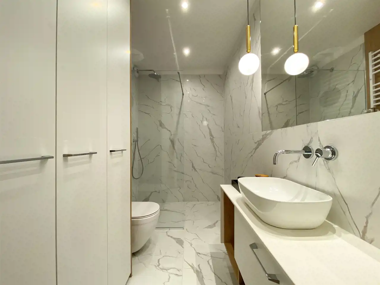Łazienka: szklany prysznic walk-in z baterią z deszczownicą, podwieszane WC, umywalka nablatowa oraz szuflady, zabudowa meblowa z pralką.