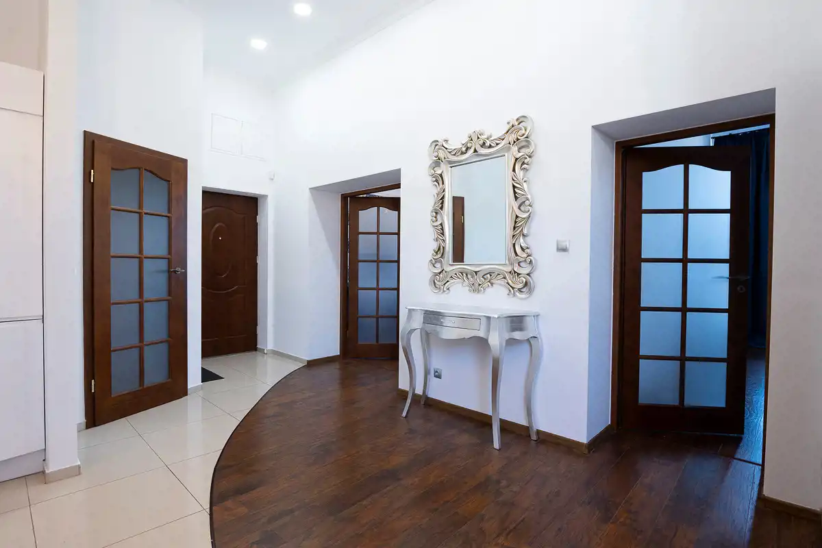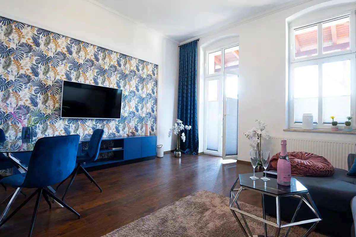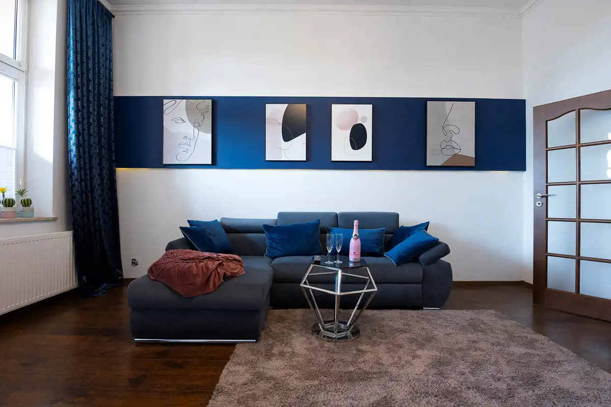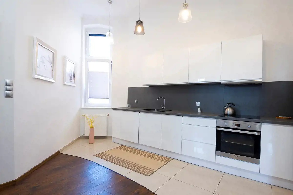 Mieszkanie jest wykończone z najwyższej jakości materiałów oraz w pełni wyposażone w sprzęty użytku codziennego, włącznie ze sprzętem RTV oraz AGD.