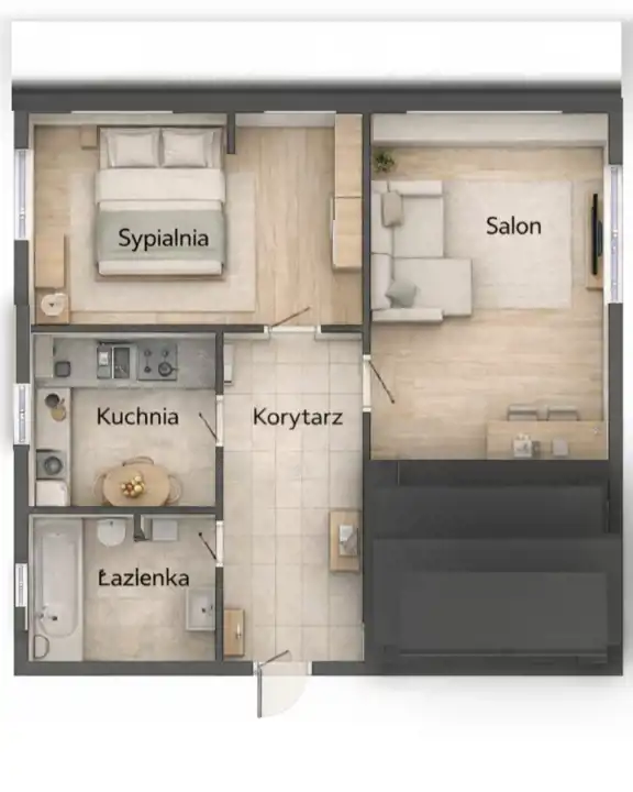 • funkcjonalny, dwustronny układ mieszkania, zapewniający dobre doświetlenie oraz ciepłą, przytulną atmosferę