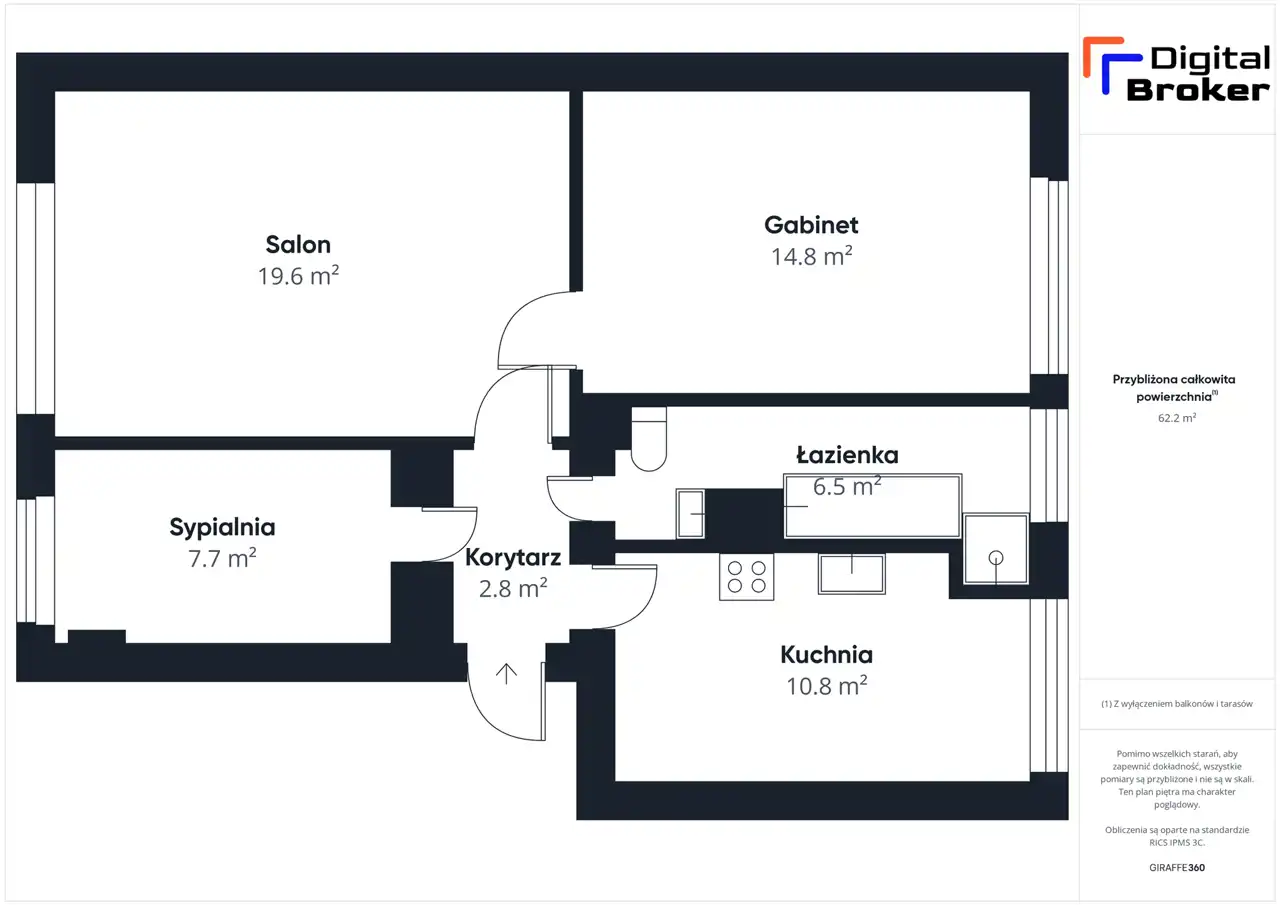 Na 62 m² znajdują się (sprawdź rozkład na załączonym planie!):