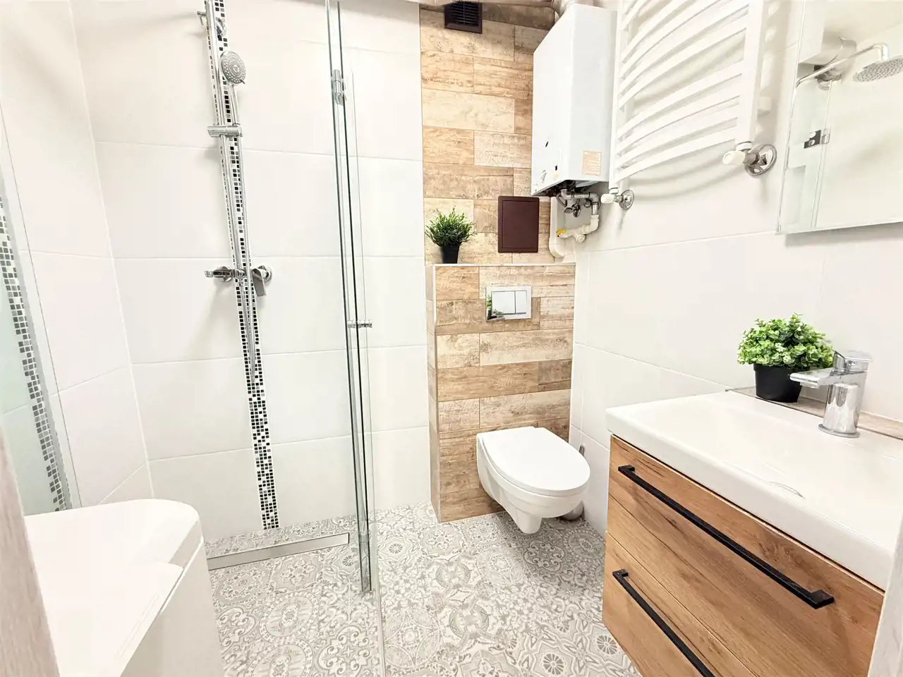 Ciepła woda — z piecyka gazowego, co daje pełną kontrolę kosztów przez cały rok.