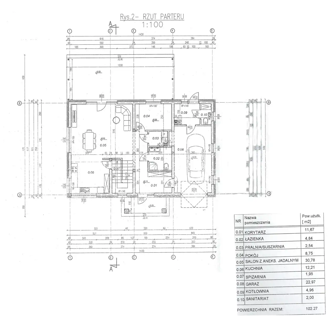Cena: 750 000 zł. Powierzchnia całkowita: 265,98 m2 Powierzchnia użytkowa: 179,99 m2 Powierzchnia użytkowa parteru:102,19 m2 Powierzchnia użytkowa poddasza: 77,80 m2 Powierzchnia zabudowy:185,56 m2 Powierzchnia tarasu: 24 m2 Powierzchnia garażu: 22,97 m 2 Powierzchnia piwnicy:18 m2 Kubatura: 767 m3 Wysokość kalenicy: 7,95 m Kąt nachylenia połaci dachu: 45° Rozpoczęcie budowy 2020 r., zakończenie 2024 r. Działka w kształcie wielokąta: 1531 m2 Dojazd drogą asfaltową, powiatową.