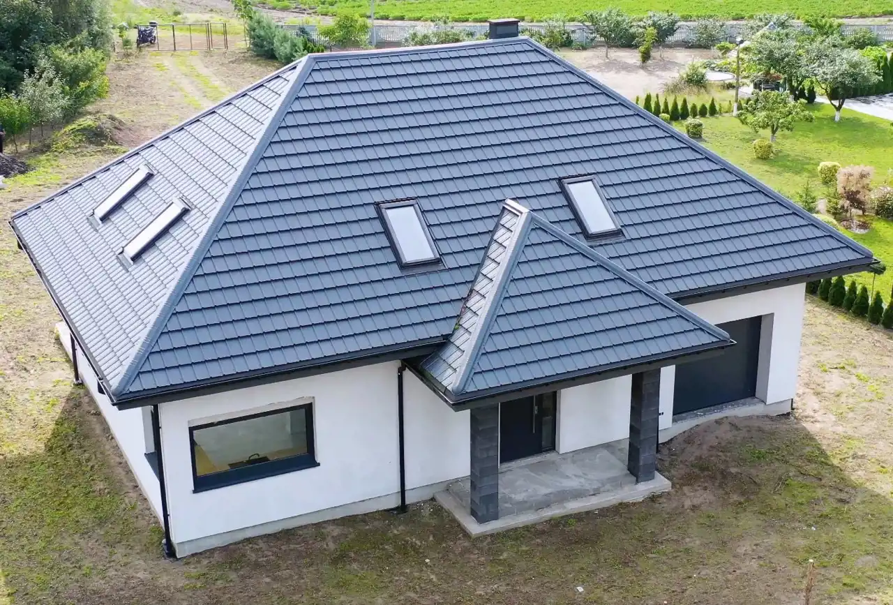 - Dach pokryty został blachodachówką modułową Murano (dodatkowo deskowany, pokryty papą i czterowarstwową membraną).
