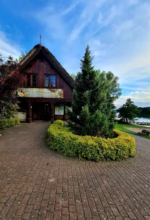 Dom otacza piękny ogród, architektura budynku jest bardzo ciekawa, a działka z budynkiem położona jest na wzgórzu wśód jezior. Spacer na pomost i na plażę zajmuje kilka minut.