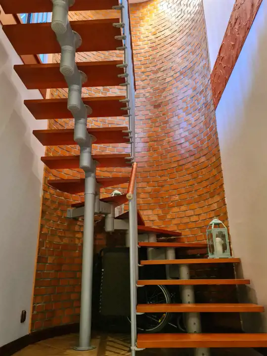 - piękna klatka schodowa z ażurowymi schodami i obudowana cegłą klinkierową