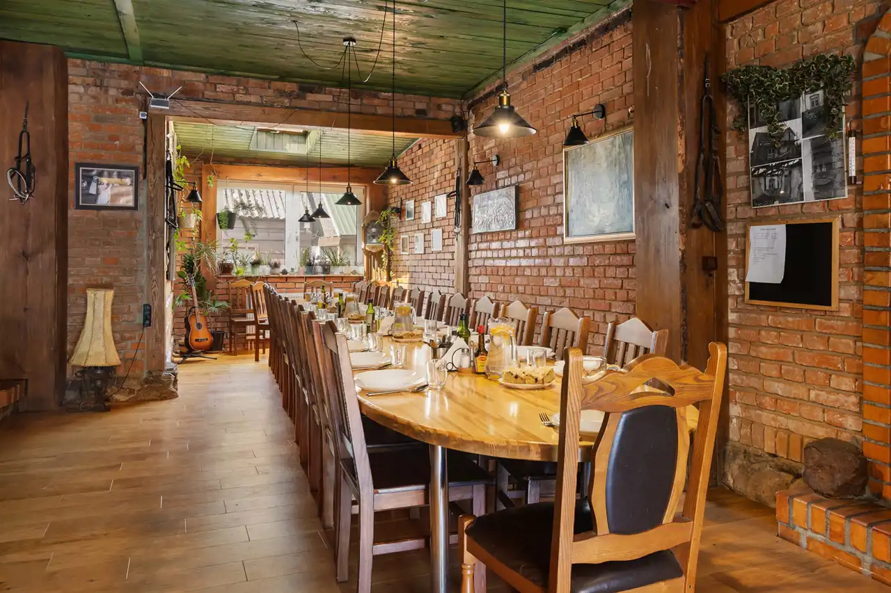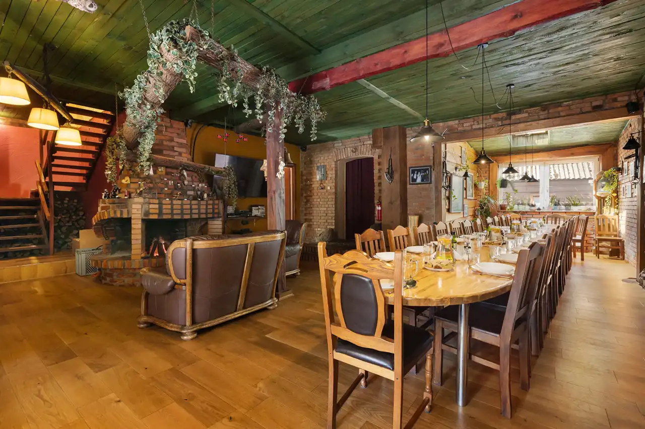 - rozwinięte profesjonalne zaplecze gastronomiczne: duża sala z kominkiem i unikalnym wystrojem która jest w stanie jednorazowo ugościć ok 60 osób, w pełni wyposażona kuchnia wraz z personelem