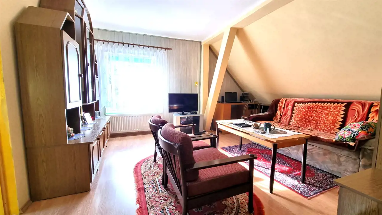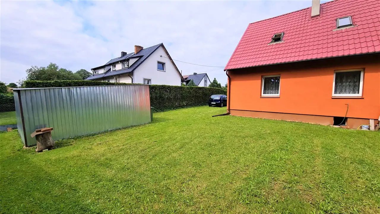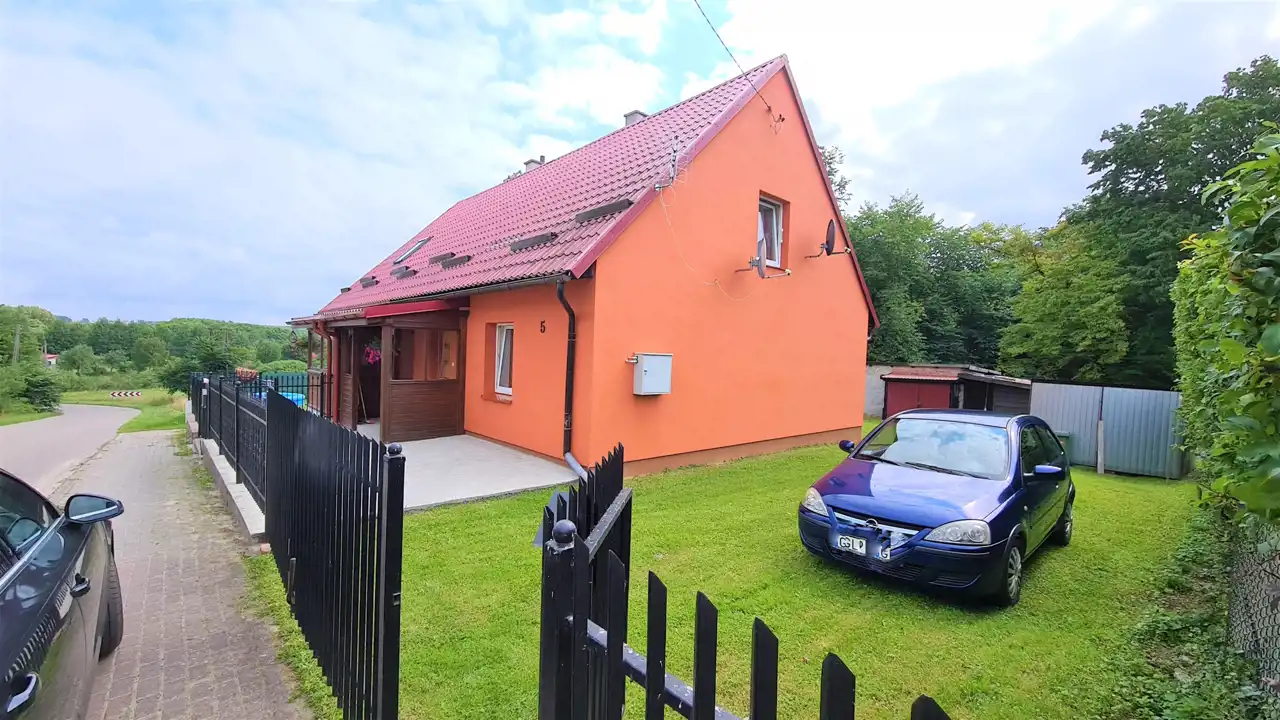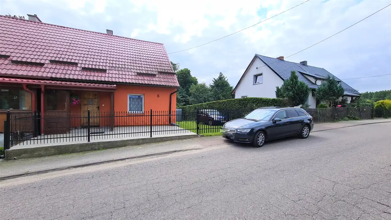 Domek w zabudowie bliźniaczej z użytkowym poddaszem, o powierzchni użytkowej 41m2, całkowitej 81m2. Bezczynszowy z dwoma garażami, położony w malowniczej okolicy otulonej lasami i wzgórzami, zaledwie 8km od centrum gminnej miejscowości Cewice. Nieruchomość usytuowana na zagospodarowanej, ogrodzonej działce o powierzchni 455m2, na której znajdują się wspomniane garaże i budynek gospodarczy. Nieruchomość wymaga wkładu finansowego, jednak można zamieszkać i z czasem aranżować według gustu. Parter składa się z wiatrołapu, korytarza z drewnianymi schodami, dwóch pokoi oraz kuchni, w której znajduje się piec na paliwo stałe. Na drugą kondygnację prowadzą schody, gdzie usytuowany jest korytarz, dwa pokoje, kuchnia oraz łazienka z wc i wanną. Ze względu na położenie - cicha, spokojna okolica oraz cenę, oferta jest godna polecenia.