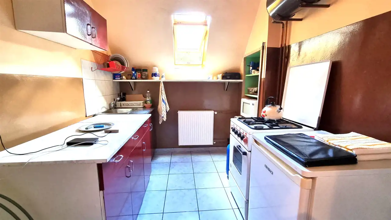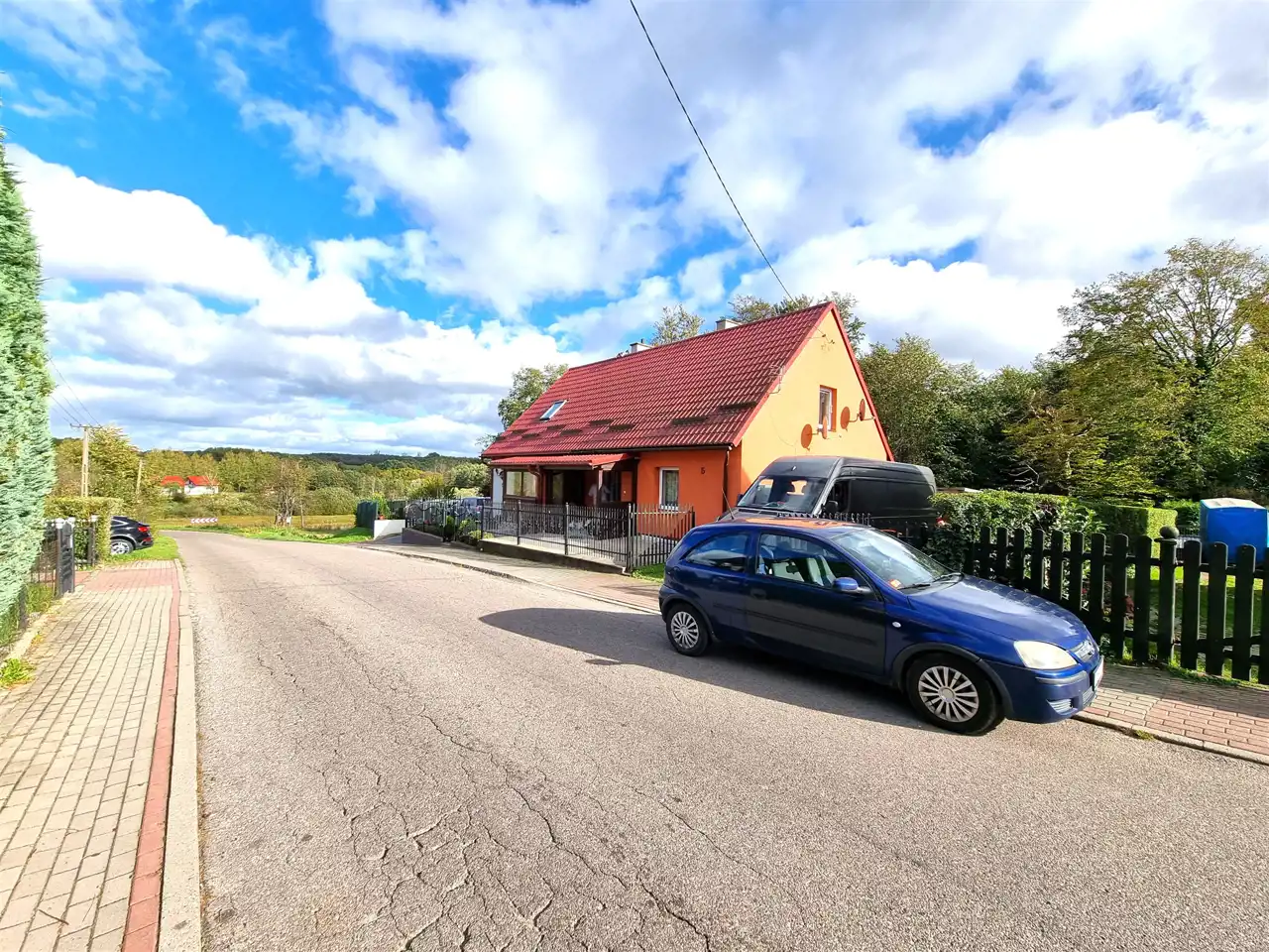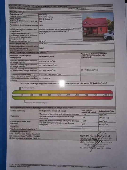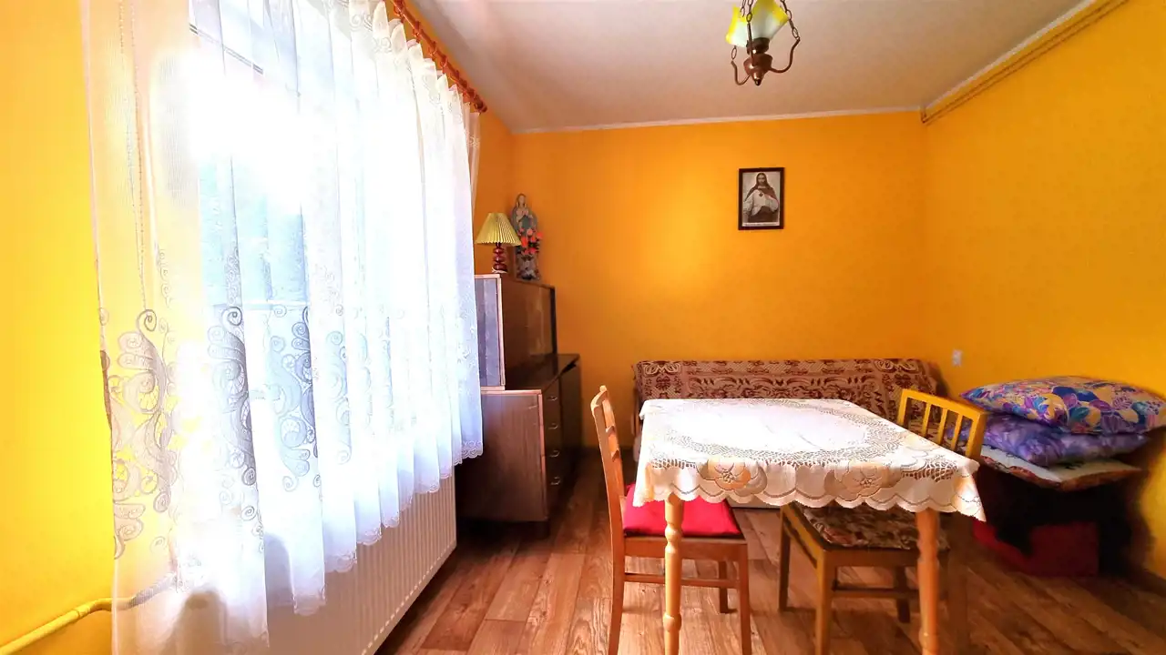 Domek w zabudowie bliźniaczej z użytkowym poddaszem, o powierzchni użytkowej 41m2, całkowitej 81m2. Bezczynszowy z dwoma garażami, położony w malowniczej okolicy otulonej lasami i wzgórzami, zaledwie 8km od centrum gminnej miejscowości Cewice. Nieruchomość usytuowana na zagospodarowanej, ogrodzonej działce o powierzchni 455m2, na której znajdują się wspomniane garaże i budynek gospodarczy. Nieruchomość wymaga wkładu finansowego, jednak można zamieszkać i z czasem aranżować według gustu. Parter składa się z wiatrołapu, korytarza z drewnianymi schodami, dwóch pokoi oraz kuchni, w której znajduje się piec na paliwo stałe. Na drugą kondygnację prowadzą schody, gdzie usytuowany jest korytarz, dwa pokoje, kuchnia oraz łazienka z wc i wanną. Ze względu na położenie - cicha, spokojna okolica oraz cenę, oferta jest godna polecenia.