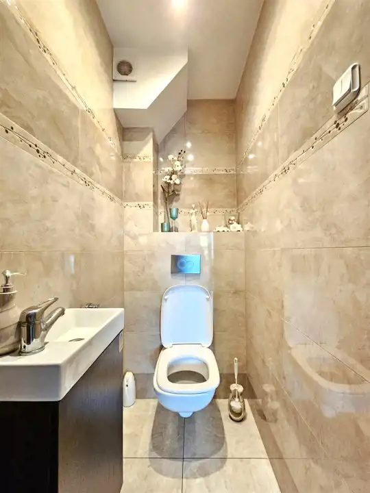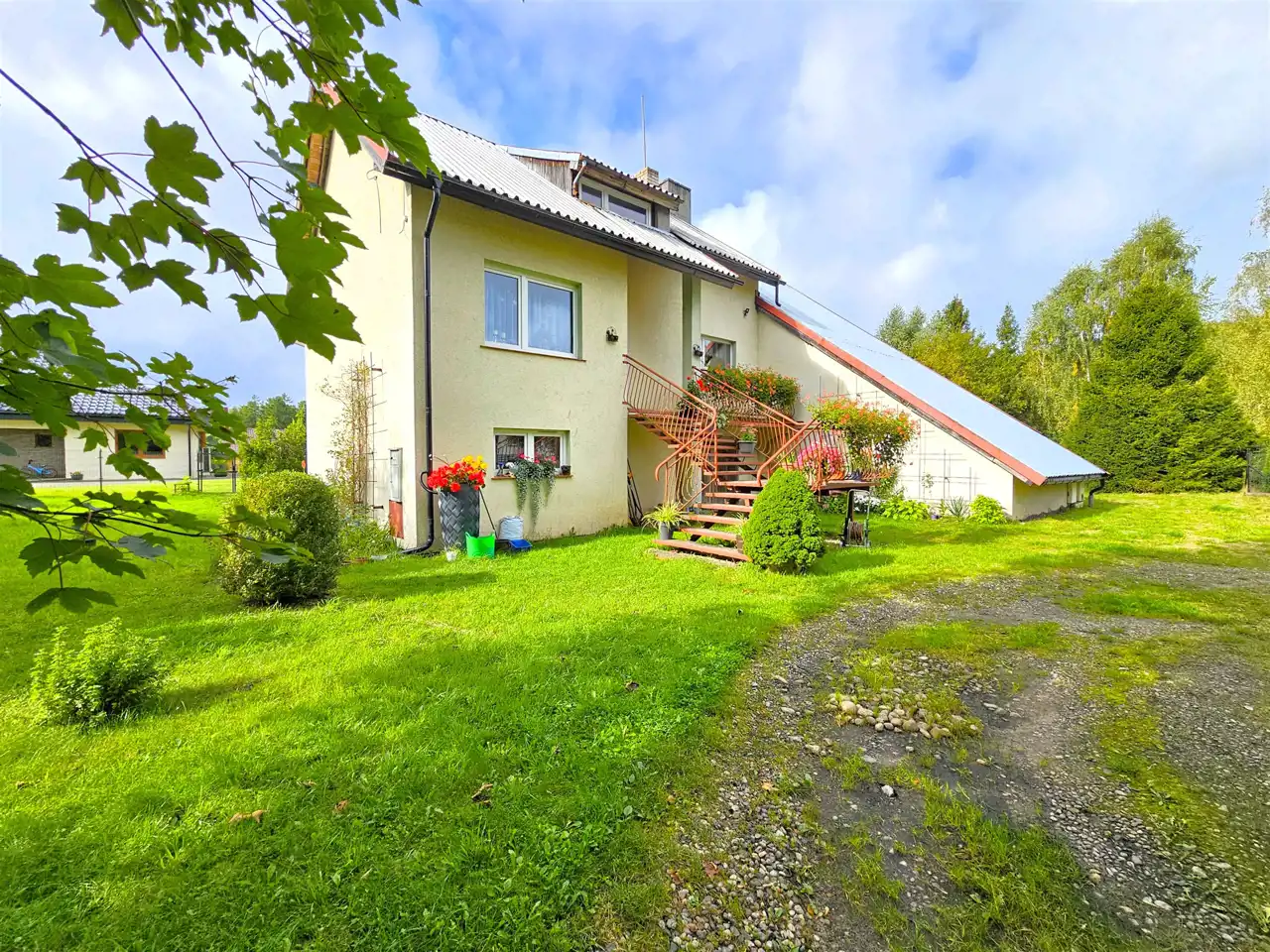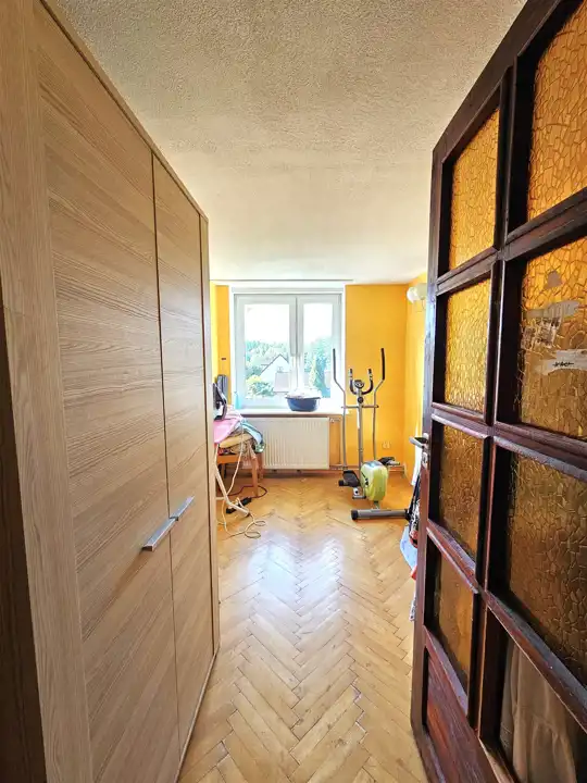 Dodatkowa przestrzeń z osobnym wejściem z ogrodu – wcześniej funkcjonowała jako samodzielne mieszkanie. Składa się z pokoju oraz łazienki z WC – idealna do przekształcenia np. na biuro, mieszkanie dla gości, gabinet lub wynajem.