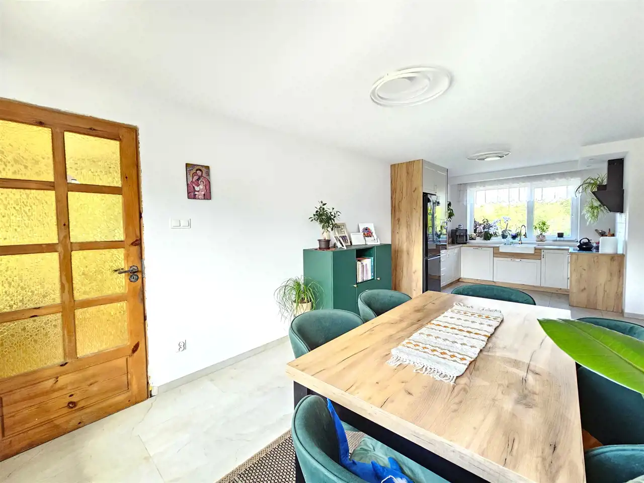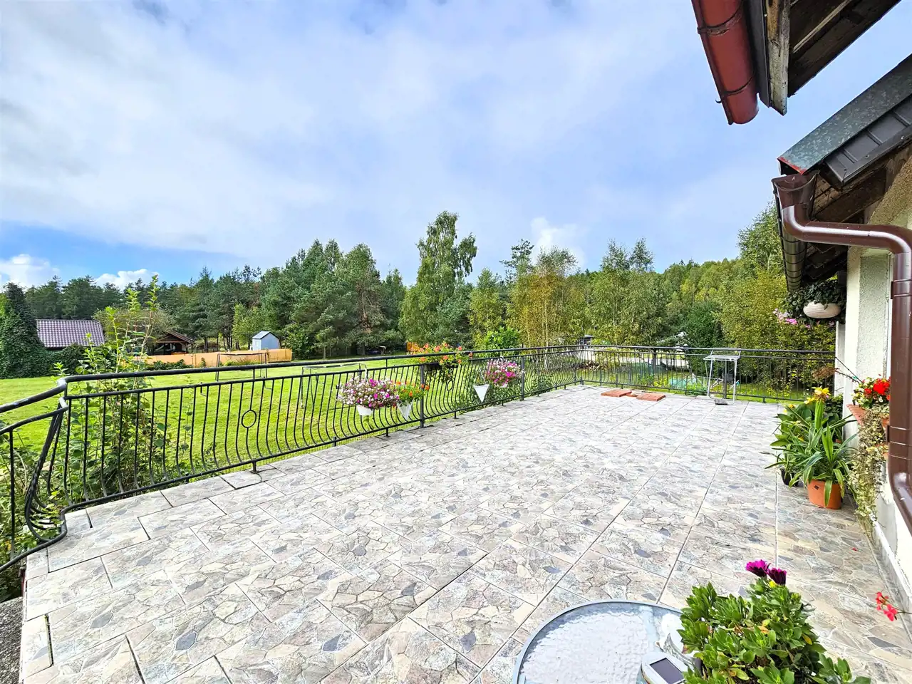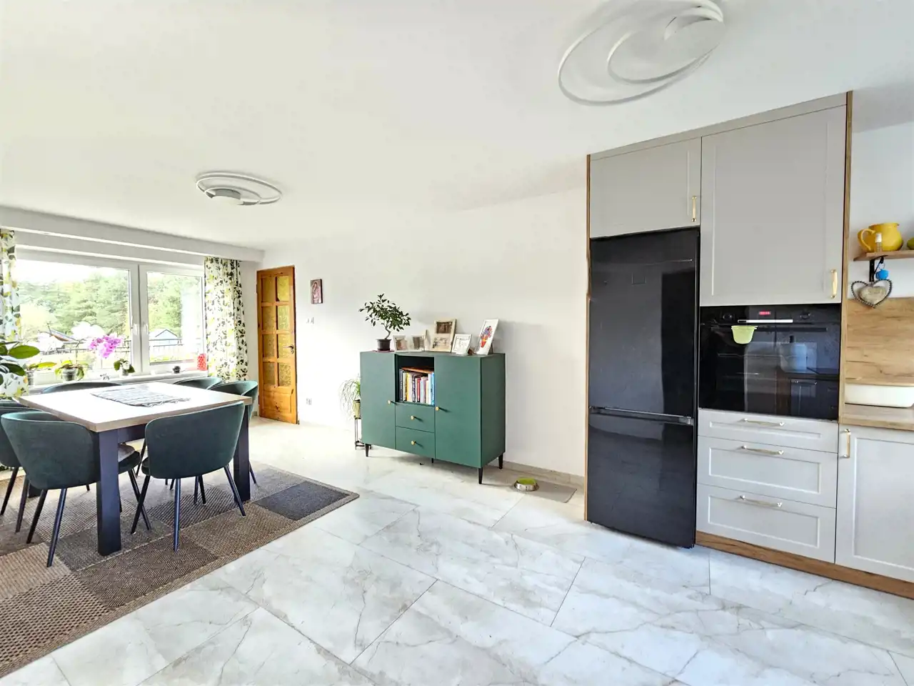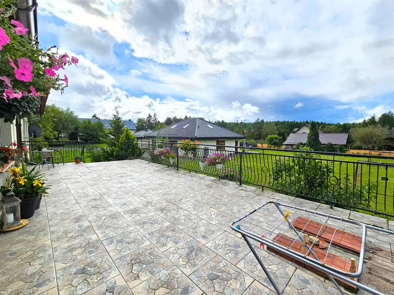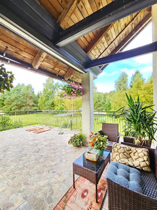 Pokój dzienny z wyjściem na duży taras – idealny do letniego wypoczynku i spotkań z rodziną lub przyjaciółmi