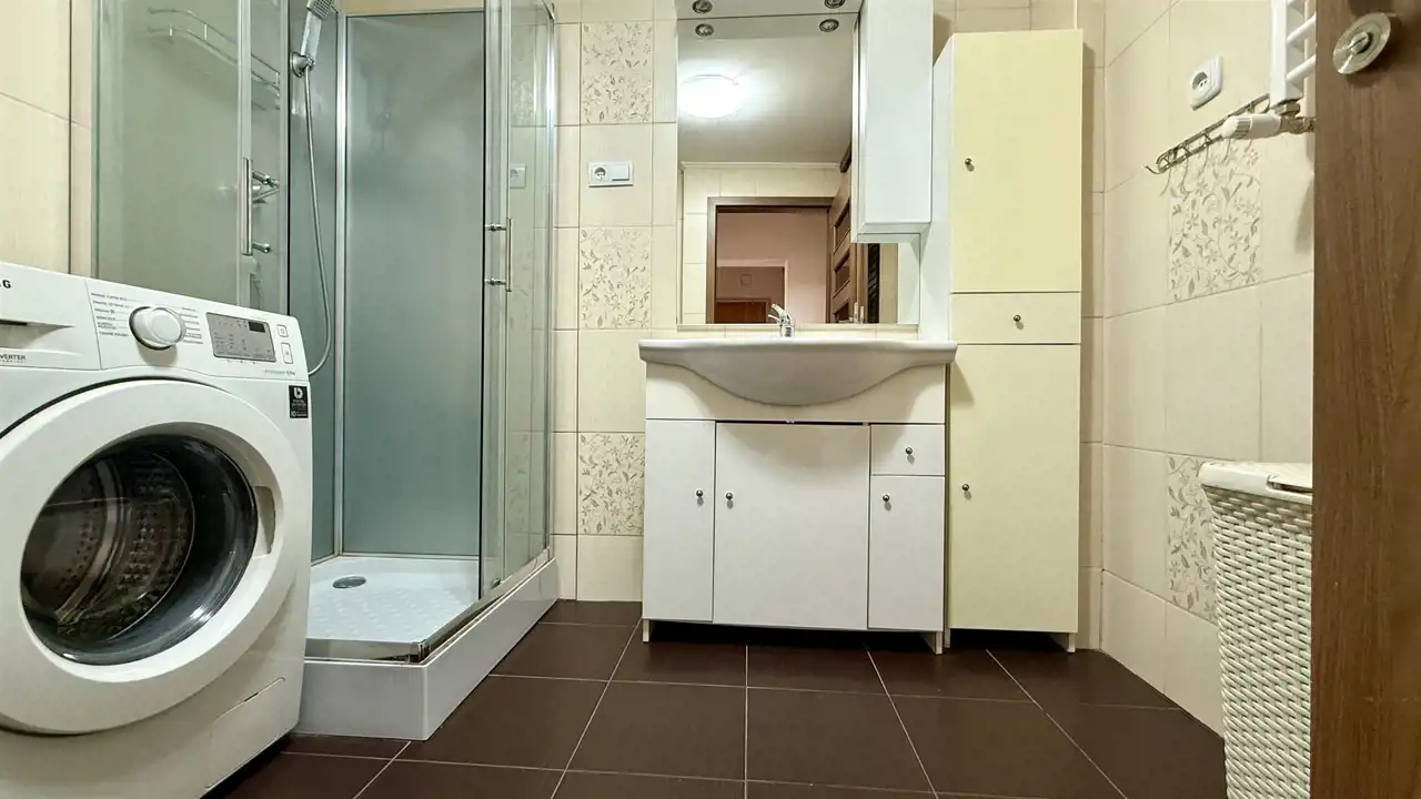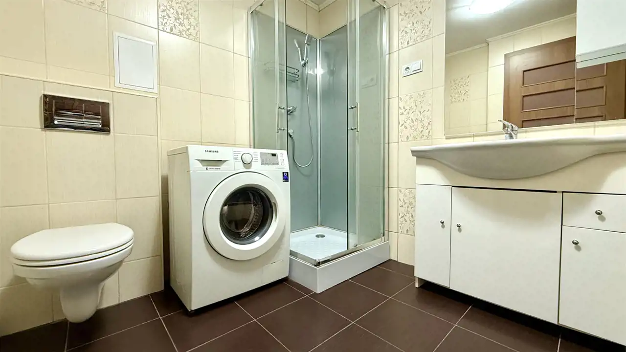 Łazienka z WC: Wykończona w jasnej kolorystyce, wyposażona w kabinę prysznicową oraz niezbędną armaturę.