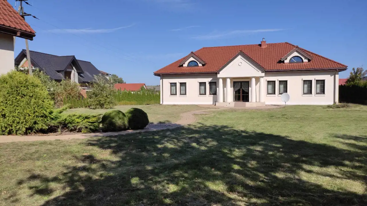 Działka, na której wybudowano dom jest częściowo ogrodzona. Dom wyposażony w alarm, rekuperację, centralny odkurzacz, domofon, elektroniczny sterownik temperatury, filtr z odwróconą osmozą, kominek oraz rolety zewnętrzne. Własna oczyszczalnia ścieków. Ogrzewanie podłogowe elektryczne, woda jest ogrzewana za pomocą pompy ciepła, 3 lata temu założono fotowoltaikę. Woda z wodociągu ( na posesji znajduje się też studnia głębinowa). Gaz- na działce. Brama wjazdowa na posesję sterowana pilotem.