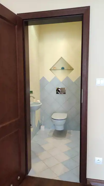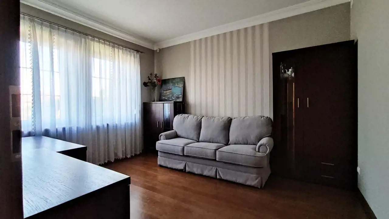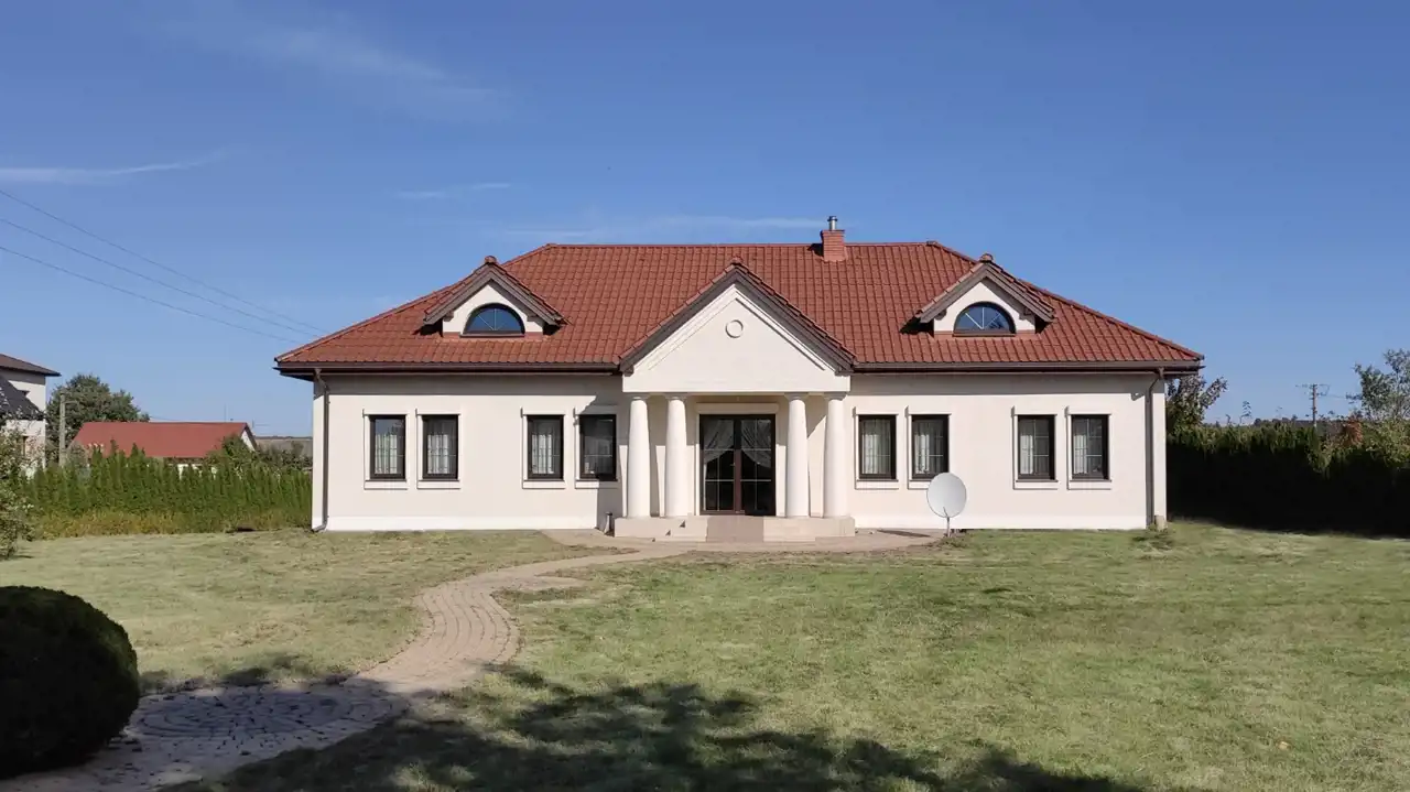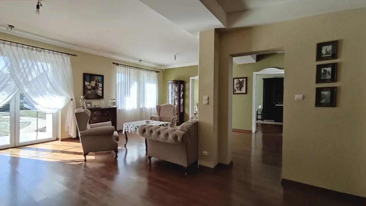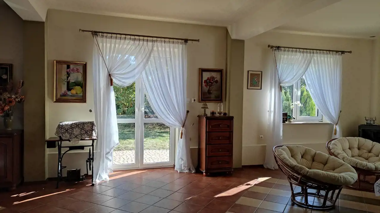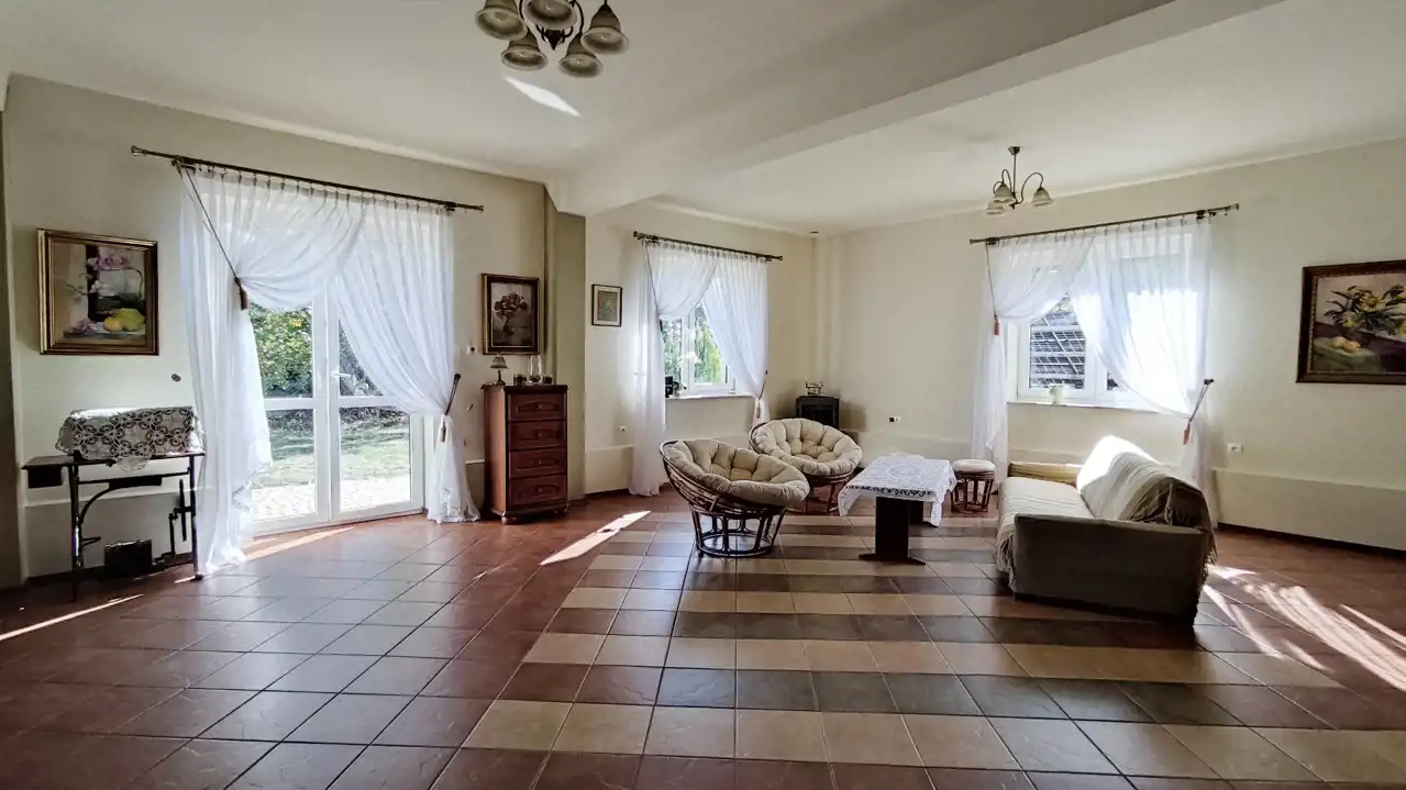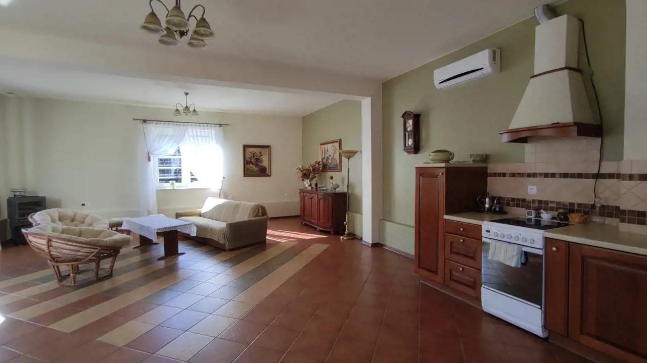 The building was constructed in 2014 using the following materials: Porotherm blocks + 15 cm of styrofoam + mineral wool + mineral plaster. The roof is covered with ceramic roof tiles, and the windows are triple-glazed PVC. The walls have a smooth finish and decorative wallpaper. The floors feature oak wood and ceramic tiles.
