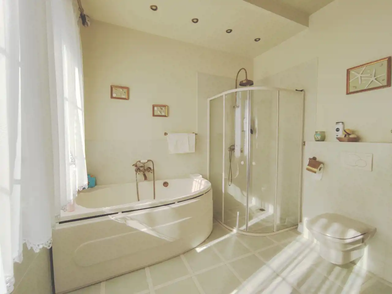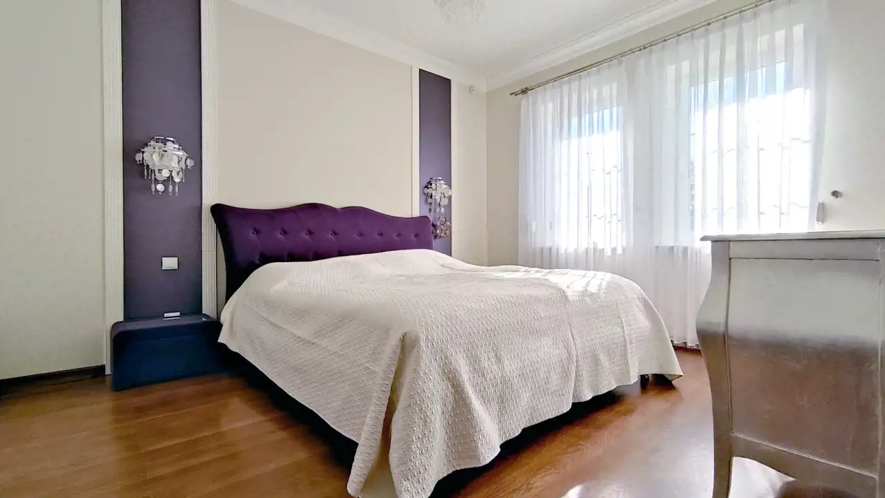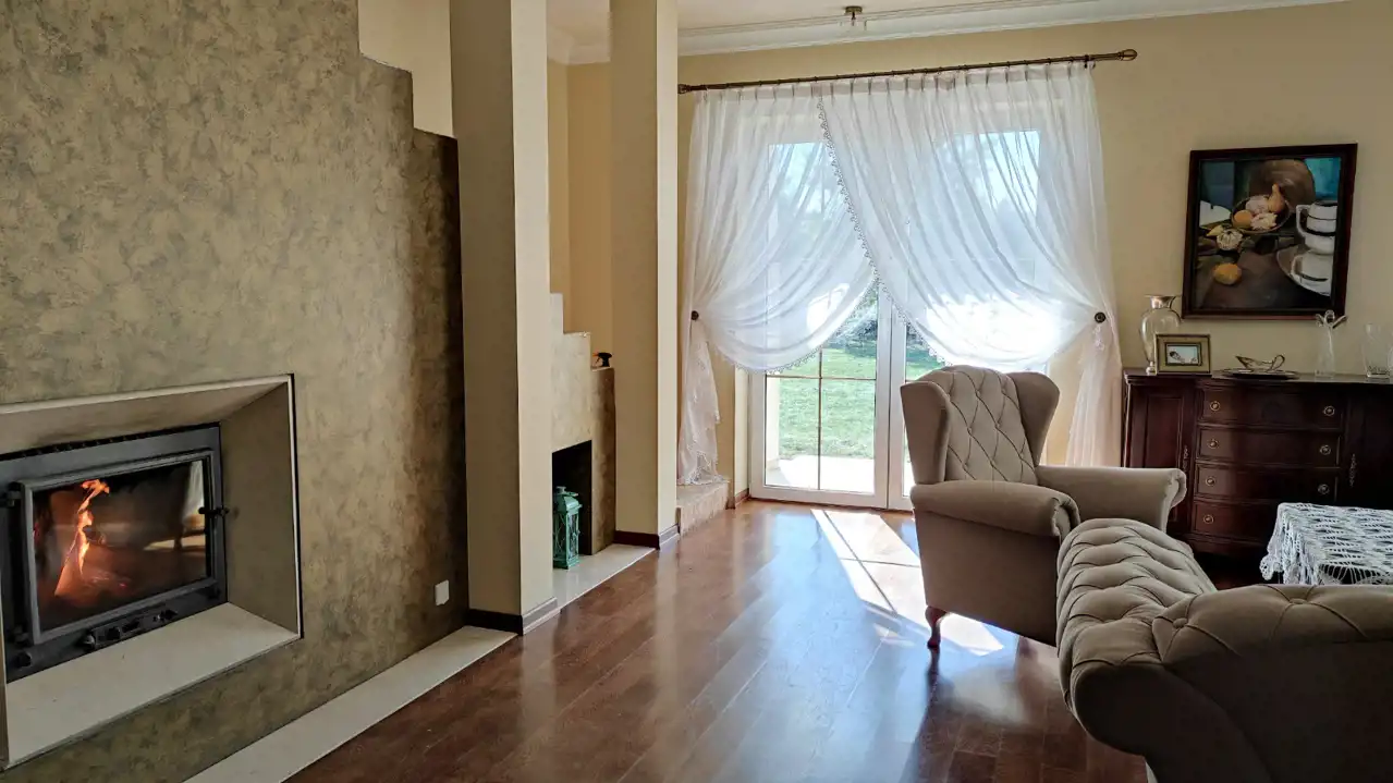 The plot where the house is located is partially fenced. The house is equipped with an alarm system, heat recovery ventilation, central vacuum, intercom, electronic temperature controller, reverse osmosis filter, fireplace, and external shutters. It has its own sewage treatment system. Electric underfloor heating and water are heated using a heat pump, and a photovoltaic system was installed three years ago. The property has access to municipal water, and there is also a deep well. Gas is available on the plot, and the entrance gate is controlled by a remote control.