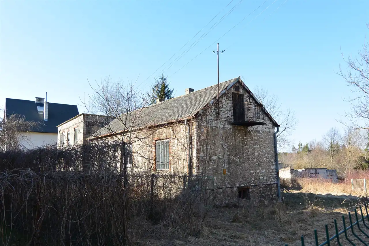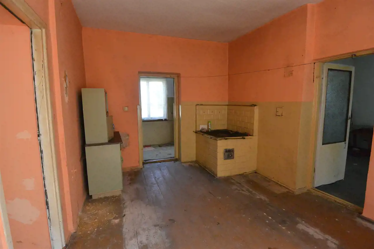 The house requires a complete renovation. There are also farm buildings on the property. The residential building was constructed in the 1950s, made of brick, with a roof covered with asbestos cement, and heated by a tiled stove. It consists of two rooms, a kitchen, a vestibule, and a porch.
