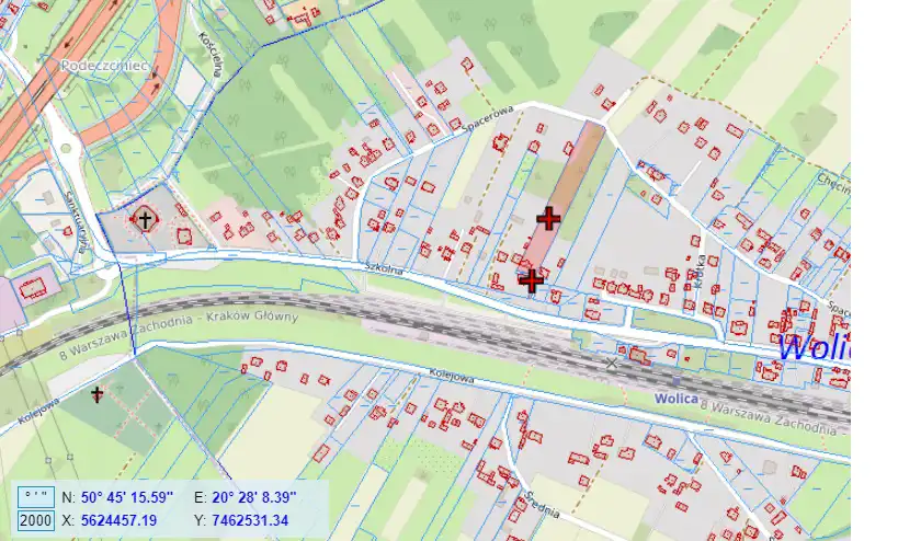 For sale: a house with an area of approximately 50 m², located on a 5,800 m² plot in Wolica, Chęciny municipality. The property is situated among green areas and single-family houses.