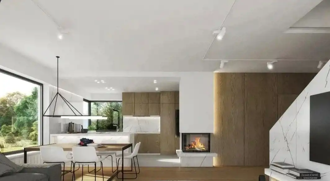 Przestronny salon z kominkiem i wyjściem na zadaszony taras,