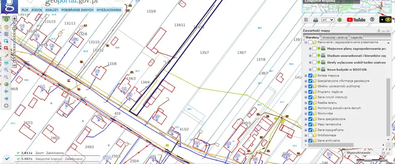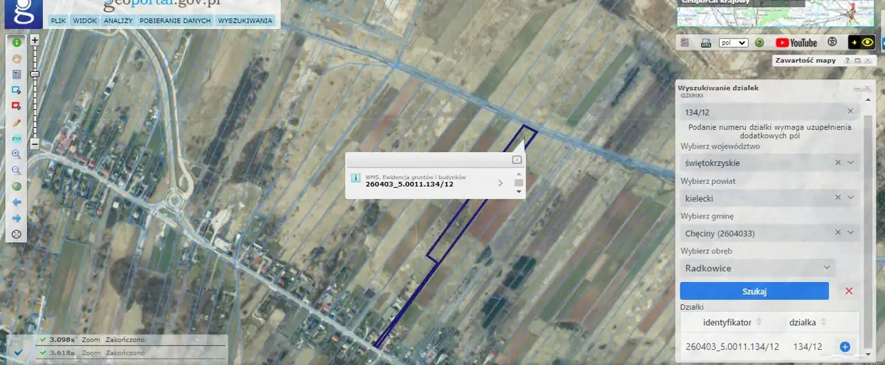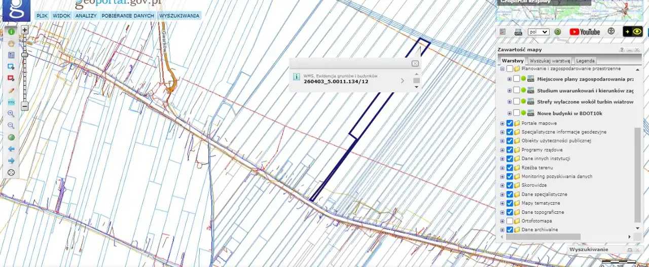 The main part of the plot is roughly rectangular, measuring approx. 33 x 367 x 33 x 360 [m]. The front part of the plot from the asphalt road serves as an access road. The rear part of the plot, covering approx. 1,250 m2, is covered by the Local Spatial Development Plan and designated as the route of the 220 kV Kielce Piaski – Radkowice transmission line, along with the expansion of the Radkowice station within the city and Chęciny municipality.